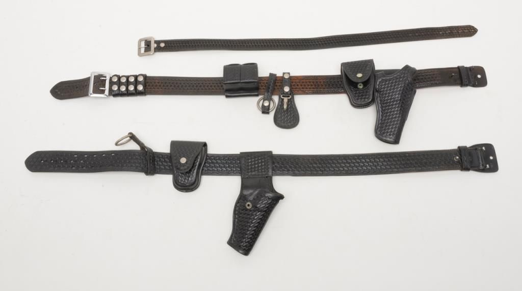 Lot of 6 holster rigs, some Law Enforcement, some Western End of Trails event style plus 2 misc. basket weave belts and a tools cartridge belt; all good quality and ranging from good to fine condition. Est.: $75-$150.