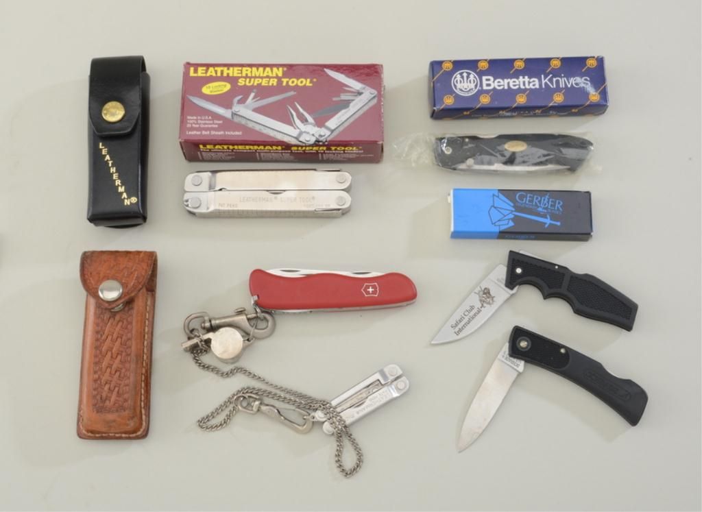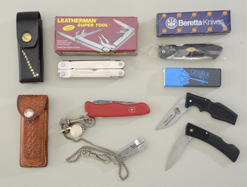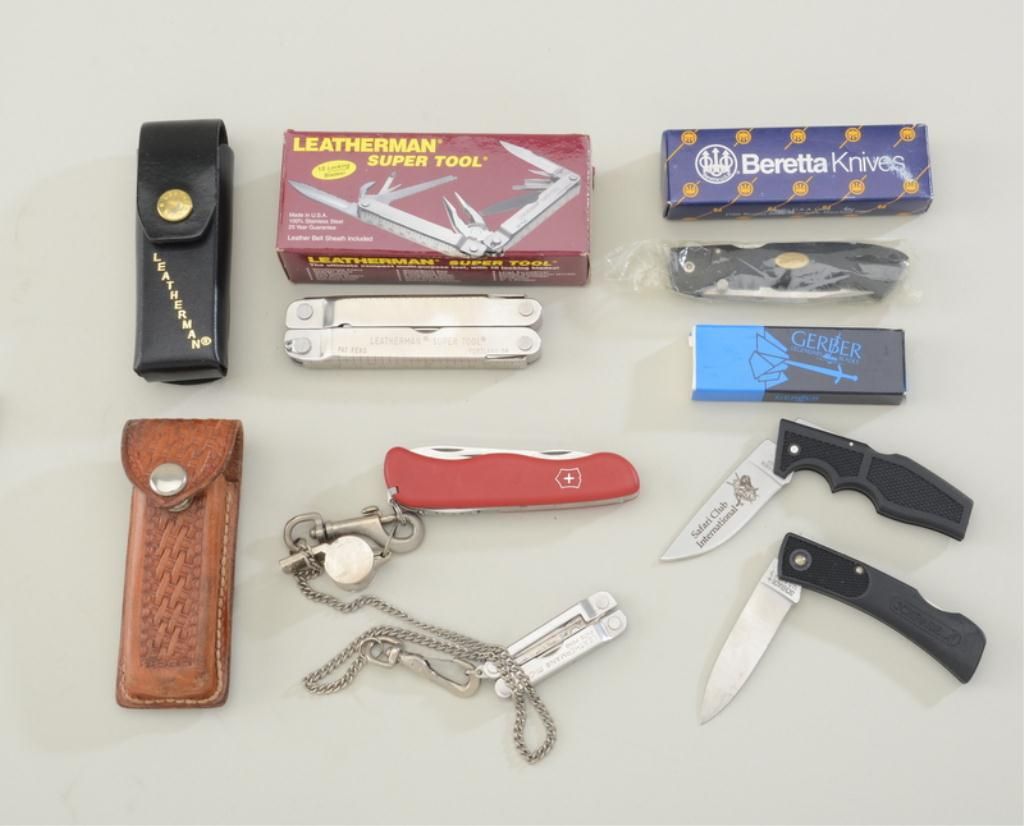 Lot of 6 misc. knives including a Schrade folder, a Beretta folder in its factory cardboard box, a small Gerber folder in its factory cardboard box, a Leatherman Super Tool in cardboard box, a Swiss Army knife insheath and a small folding leatherman’s tool. Est.: $50-$100.