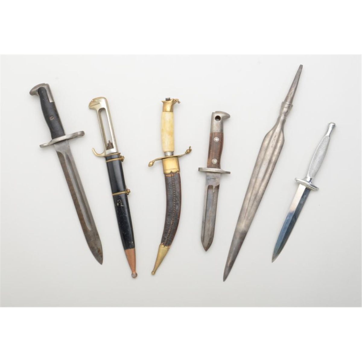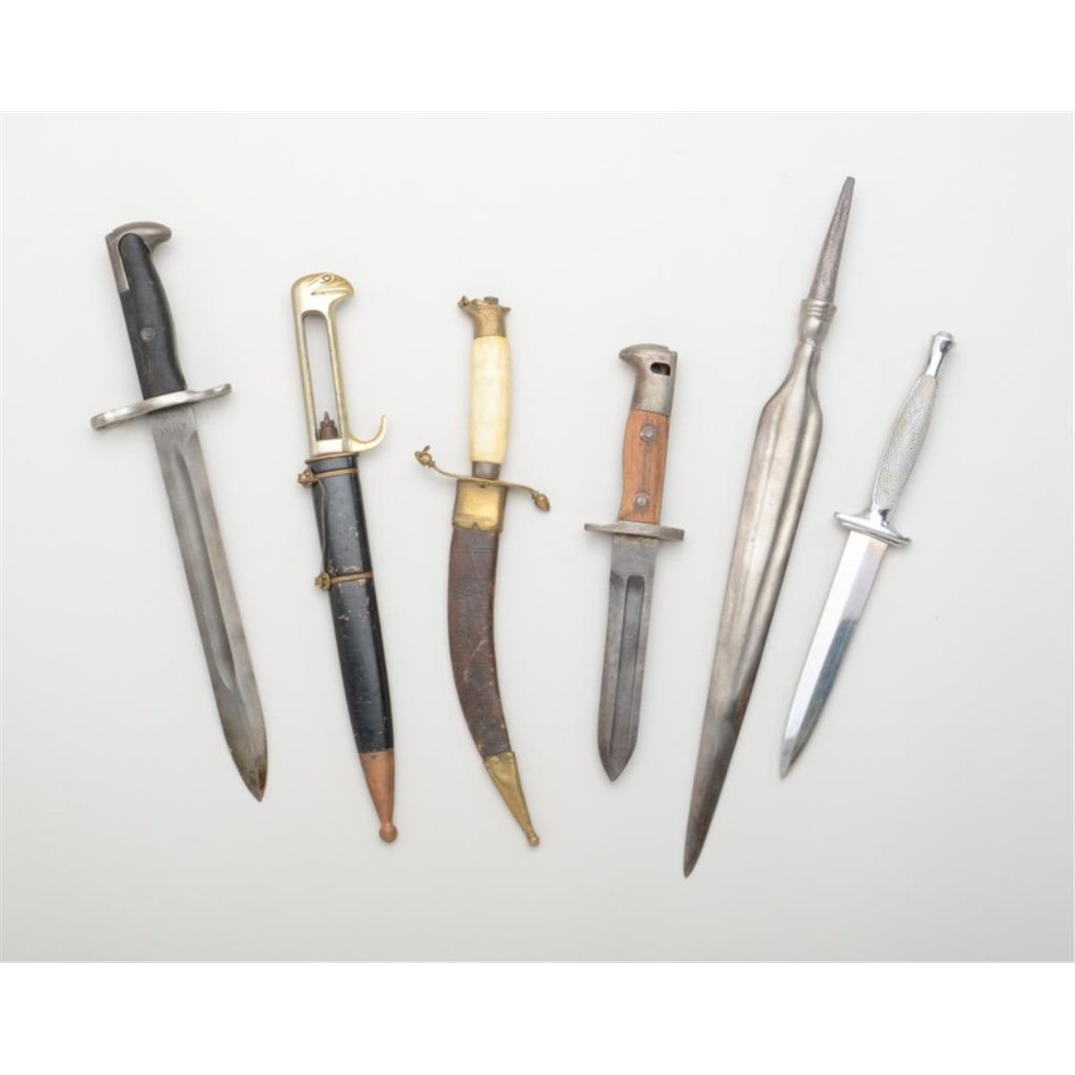 Lot of 6 misc. knives including a cut down Krag bayonet, a steel dagger, a cut down U.S. bayonet for an M1 Garand, an unmarked German style knife and metal sheath, a curved blade Mexican style knife with bone grip andleather sheath and an older cleaned Mid-eastern or African style spear point. Est.: $75-$150.