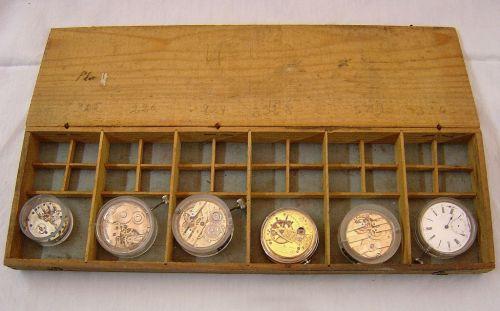 Boîte avec 6 mouvements de montres de poche: 1 VICTOR JEANNOT No 17334 GENEVE, 1 DOXA ancre chatons vissés et réglage de la raquette à col de cygne avec vis micrométrique, etc.