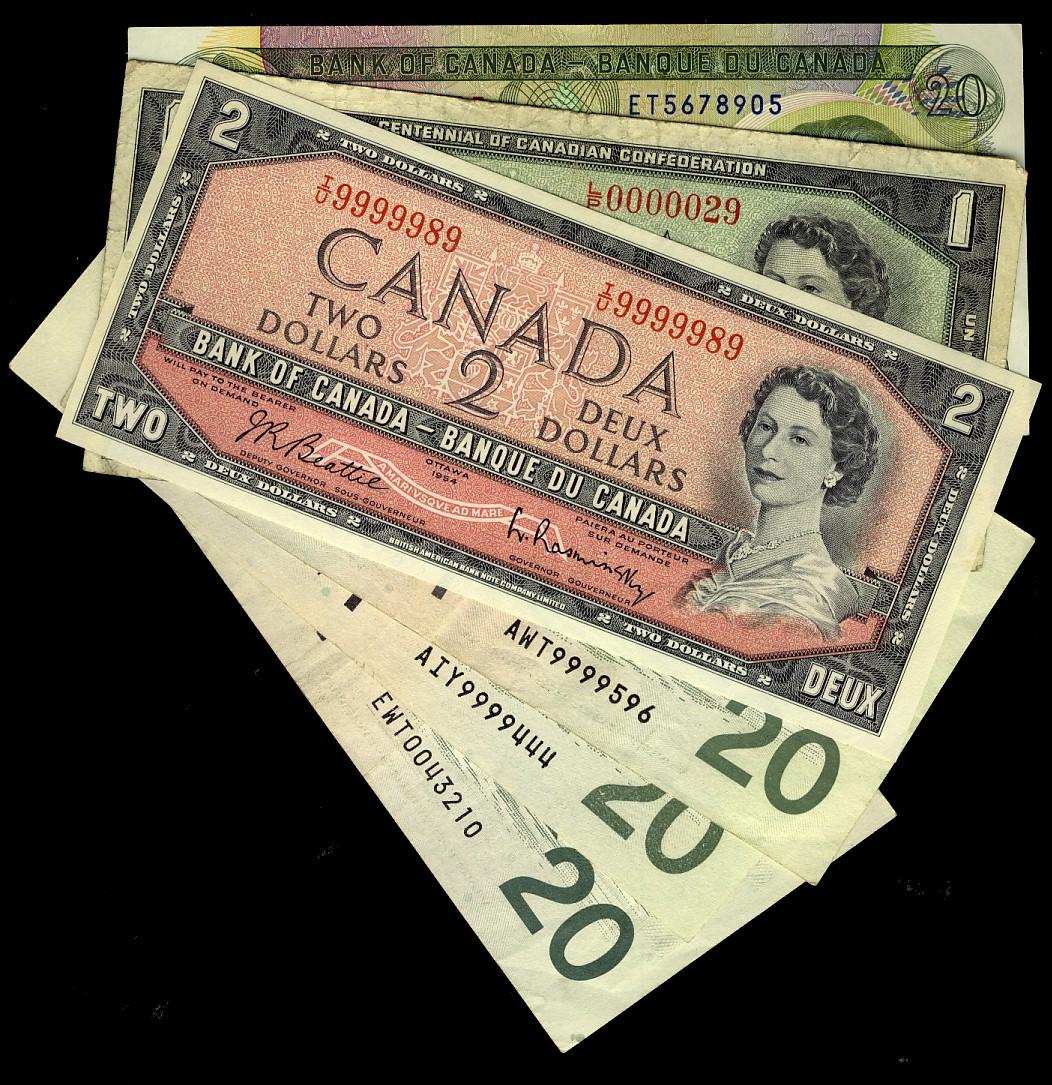 Lot of 6 notes all with SPECIAL serial numbers. Includes 1991 $20 #9999596, 9999444, 0043210, 1969 $20 #5678905, 1954 $2 #9999989 and 1967 $1 #0000029. Grades vary from F-12 to EF-40