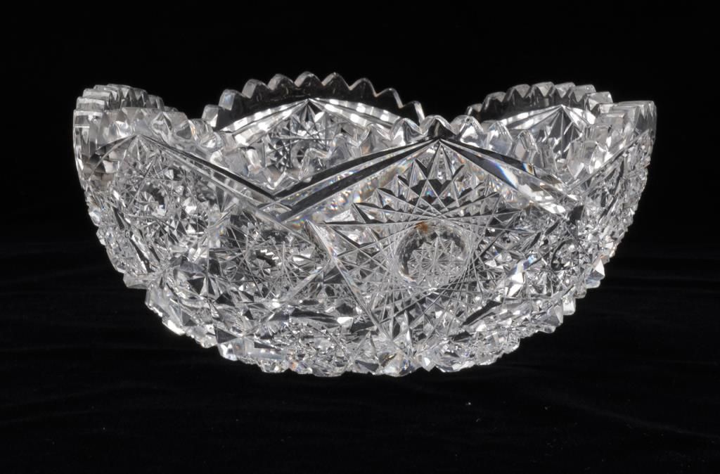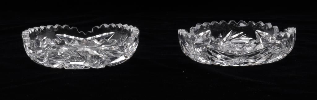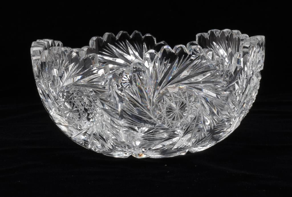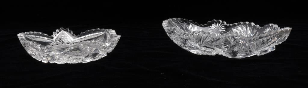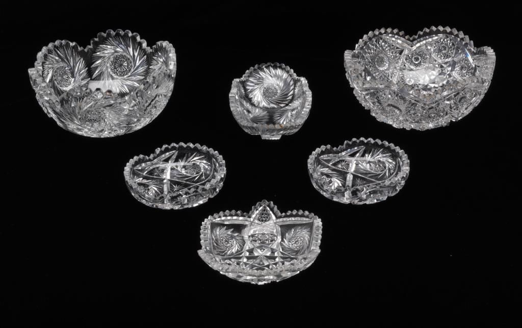 Lot of 6 pieces of matching cut crystal consisting of two bowls, each 8” in diameter; 2 small round pieces, each 5” in diameter; a triangular shaped piece, 6” in diameter and a relish dish, 8” x 4-1/2”, all in fine condition at time ofdescription. Est.: $75-$150.