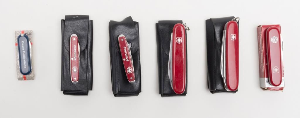 Lot of 6 pocket knives, all in fine condition; two Colonial multi-blades, each approx. 4” overall folded and two Colonial “Executive” smaller versions, each approx. 2-3/4” overall folded and each with a vinyl carry case; one Swiss Army knife folder by Victorinox “NRA”, approx. 3” folded and with cardboard box; also a Krause Publications advertising knife, approx. 2” folded; the publishers of Standard Catalogs. Est.: $100-$200.