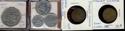 Lot of 6 tokens. Includes 3 merchant tokens from Delisle, Saskatchewan, QC merchant token ,Pulp Co. 1940's, 2 tokens from the French colonies. Should be viewed.