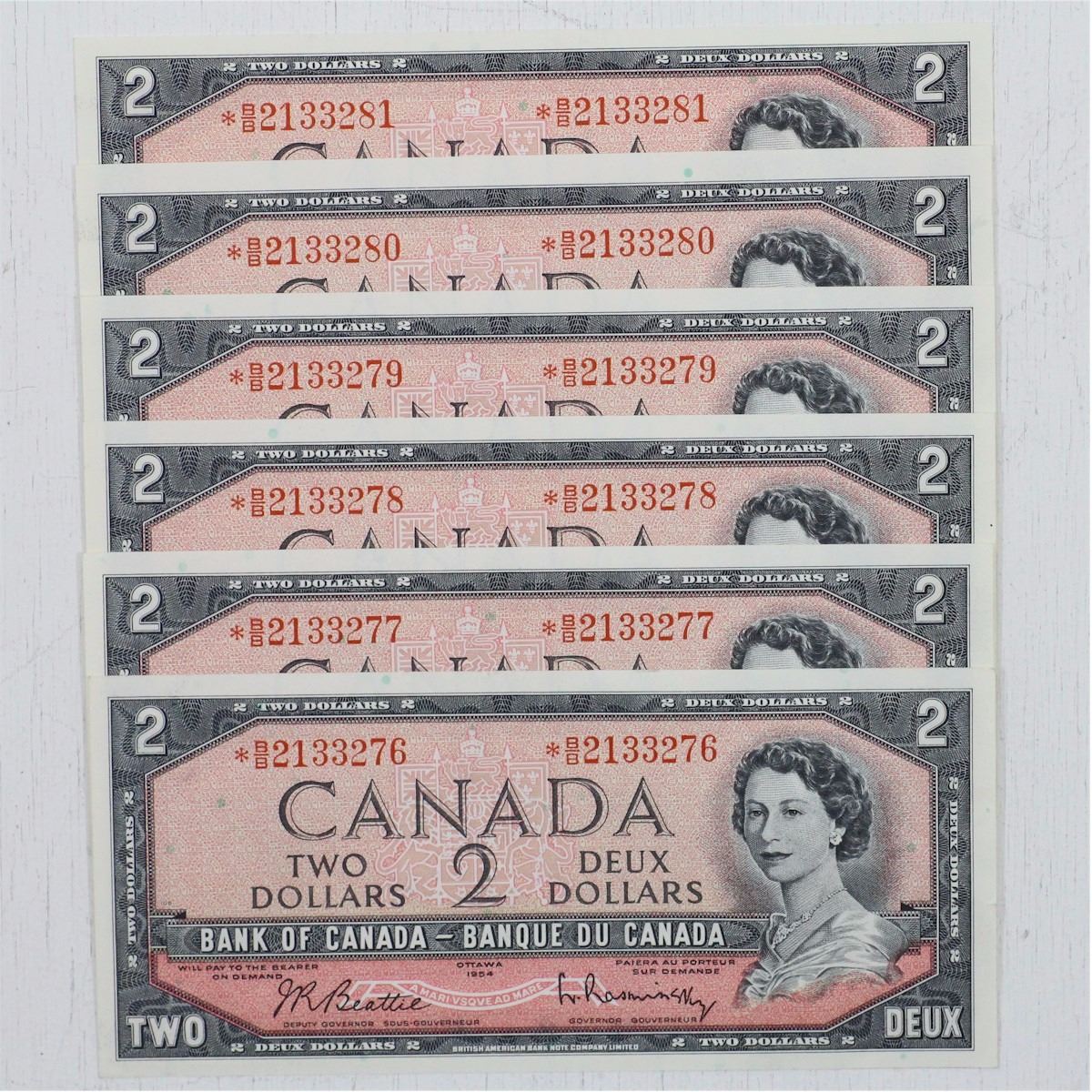 Lot of 6 x 1954 Replacement $2 with consecutive serial numbers; cat code BC-38bA, *B/B