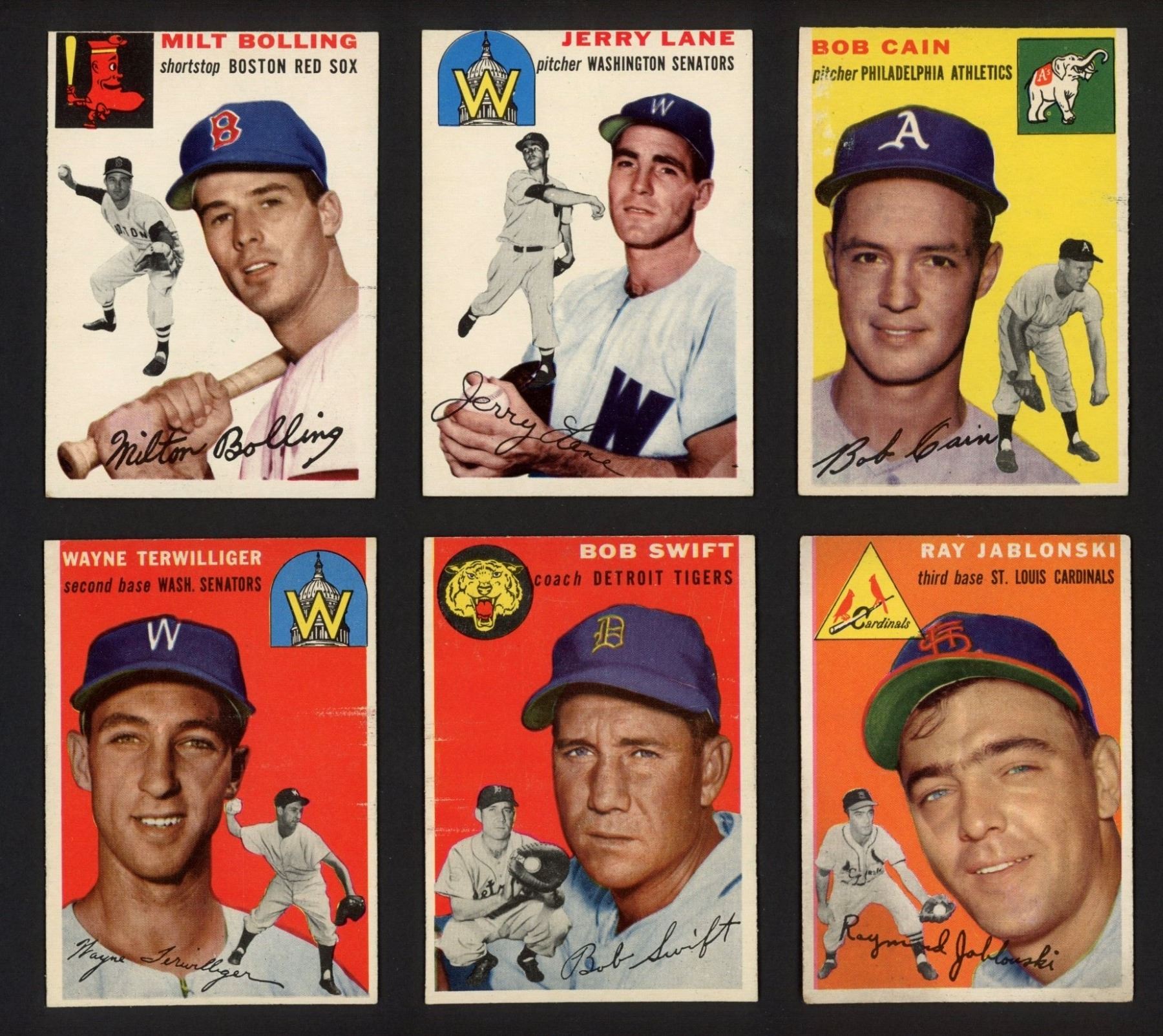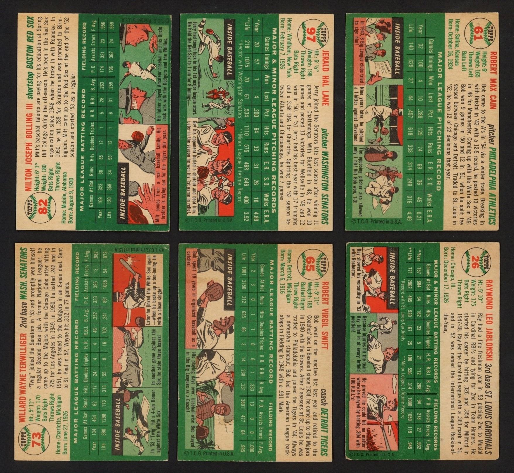 Lot contains 6 cards from the 1954 Topps baseball set, includes: #26 Ray Jablonski EX, #61 Bob Cain VG-EX, #65 Bob Swift EX, #73 Wayne Terwilliger VG-EX, #82 Milt Bolling VG-EX, #97 Jerry Lane EX+.