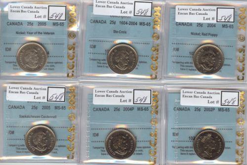Lot of 6 x 25 Cents all CCCS certified MS-65. 2002P, 2004P, 2004P Red Poppy, 1604-2004P Ste-Croix, 2005P Veteran & 2005P Saskatchewan. All gems from rolls.