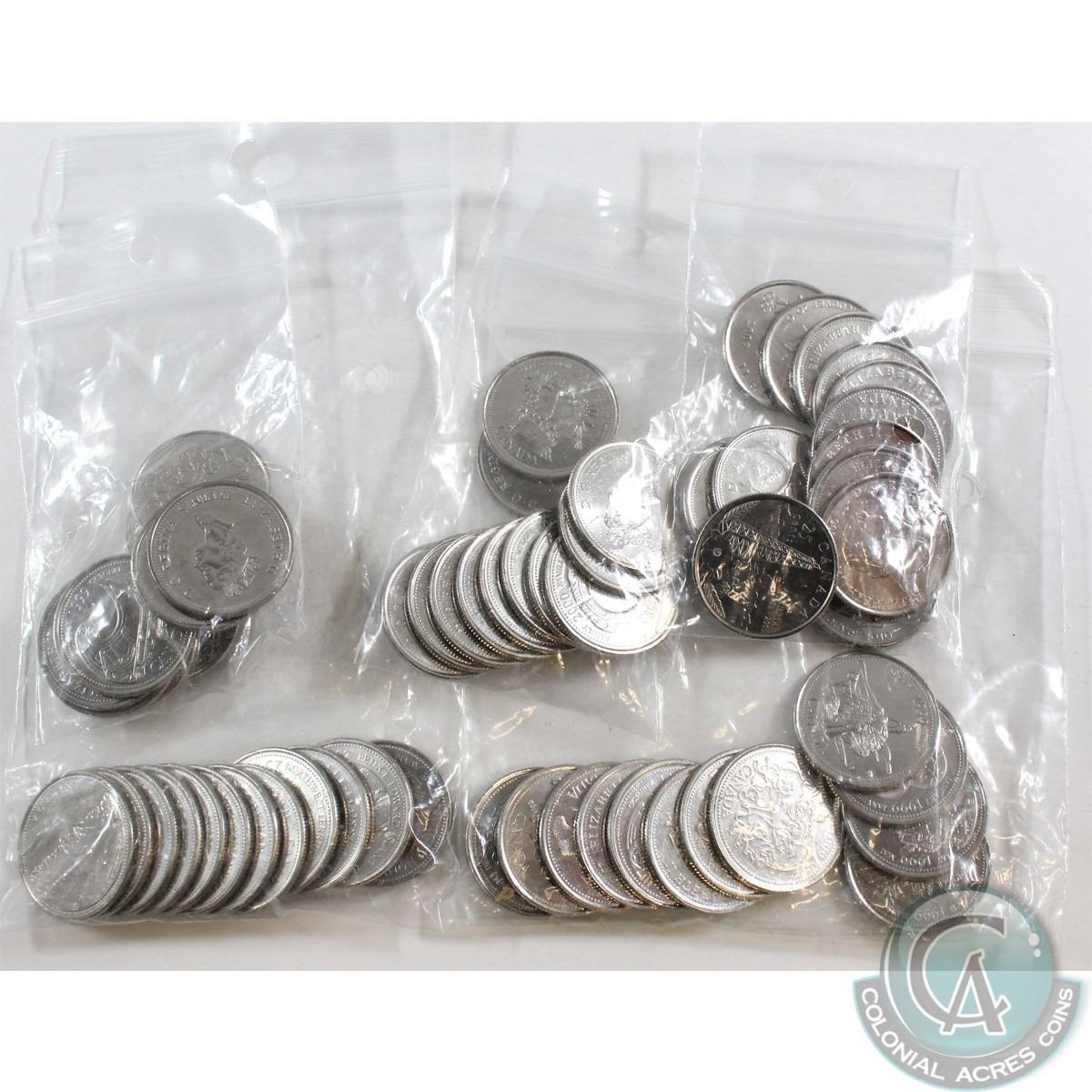 Lot of 62x Canada Commemorative 25-cents. You will receive 12x 1992, 24x 1999, 12x 2000 & 14x 2002-2007 Miscellaneous with some Coloured. 62pcs