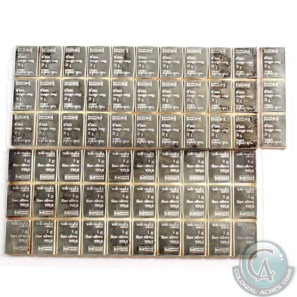 Lot of 63x 1g Valcambi Suisse Fine Silver Bars. You will receive 2x 30-bar attached Sheets and a 3-bar attached (the bars are toned) 63pcs