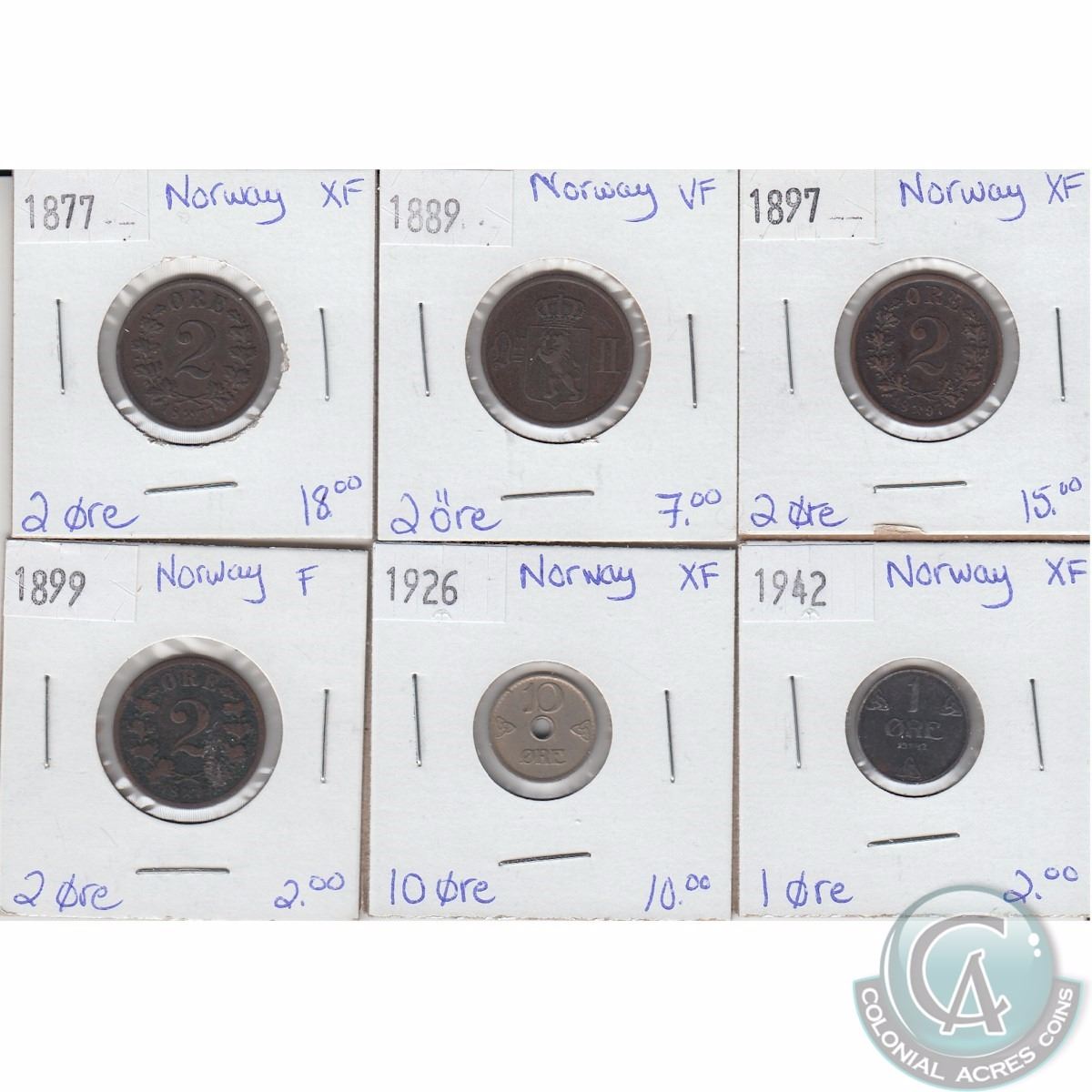 Lot of 6x 1877-1942 Norwegian Coins. This lot includes the following: 1877 2 ore, 1889 2 ore, 1899 2 ore, 1897 2 ore, 1926 10 ore, and 1942 1 ore. (6pcs)