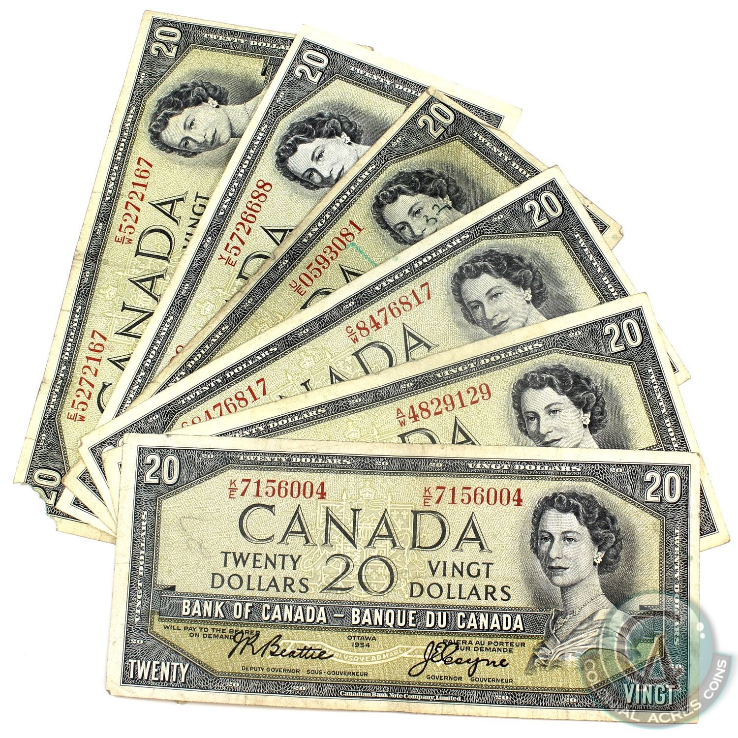 Lot of 6x 1954 $20 Modified Portrait Bank of Canada Notes All Different Prefixes - 1x BC-41a & 5x BC-41b. 6pcs