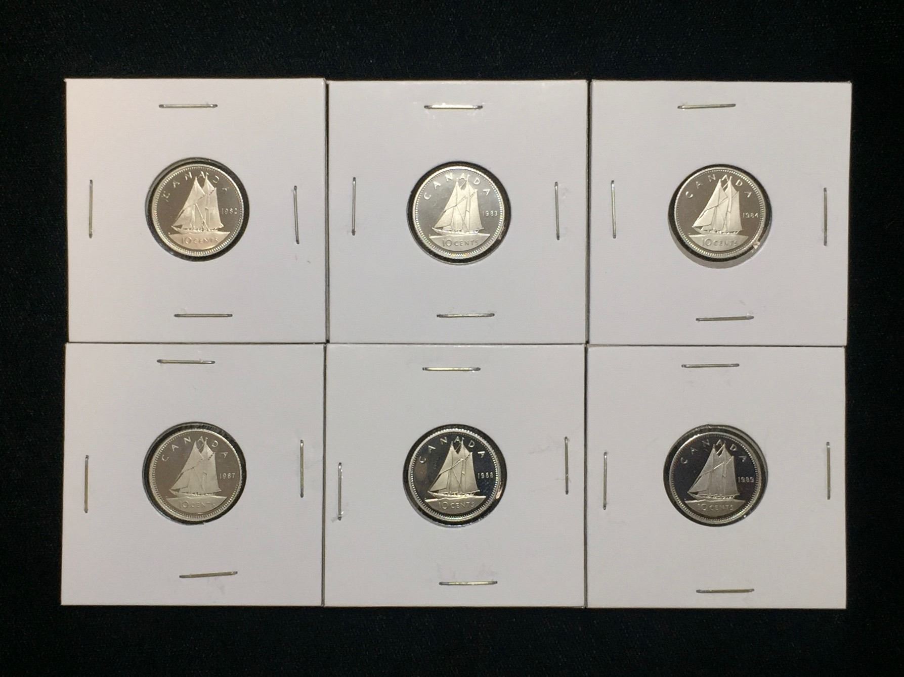 Lot 86; Royal Canadian Mint, Lot of 6x Canada 10-Cents Proof Coins, Dates Include 1982, 1983, 1984, 1987, 1988, 1989, Proof Finish, Queen Elizabeth II Tiara Portrait, Condition as Pictured