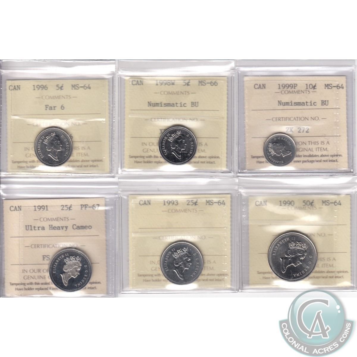 Lot of 6x Canada 5-cent, 10-cent, 25-cent & 50-cent ICCS Certified Coins Dated 5-cent: 1996 Far 6 MS-64, 1998W MS-66 Numismatic BU, 10-cent 1999P MS-64 Numismatic BU, 25-cent: 1991 PF-67 Ultra Heavy Cameo, 1993 MS-64 & 50-cent 1990 MS-64. 6pcs