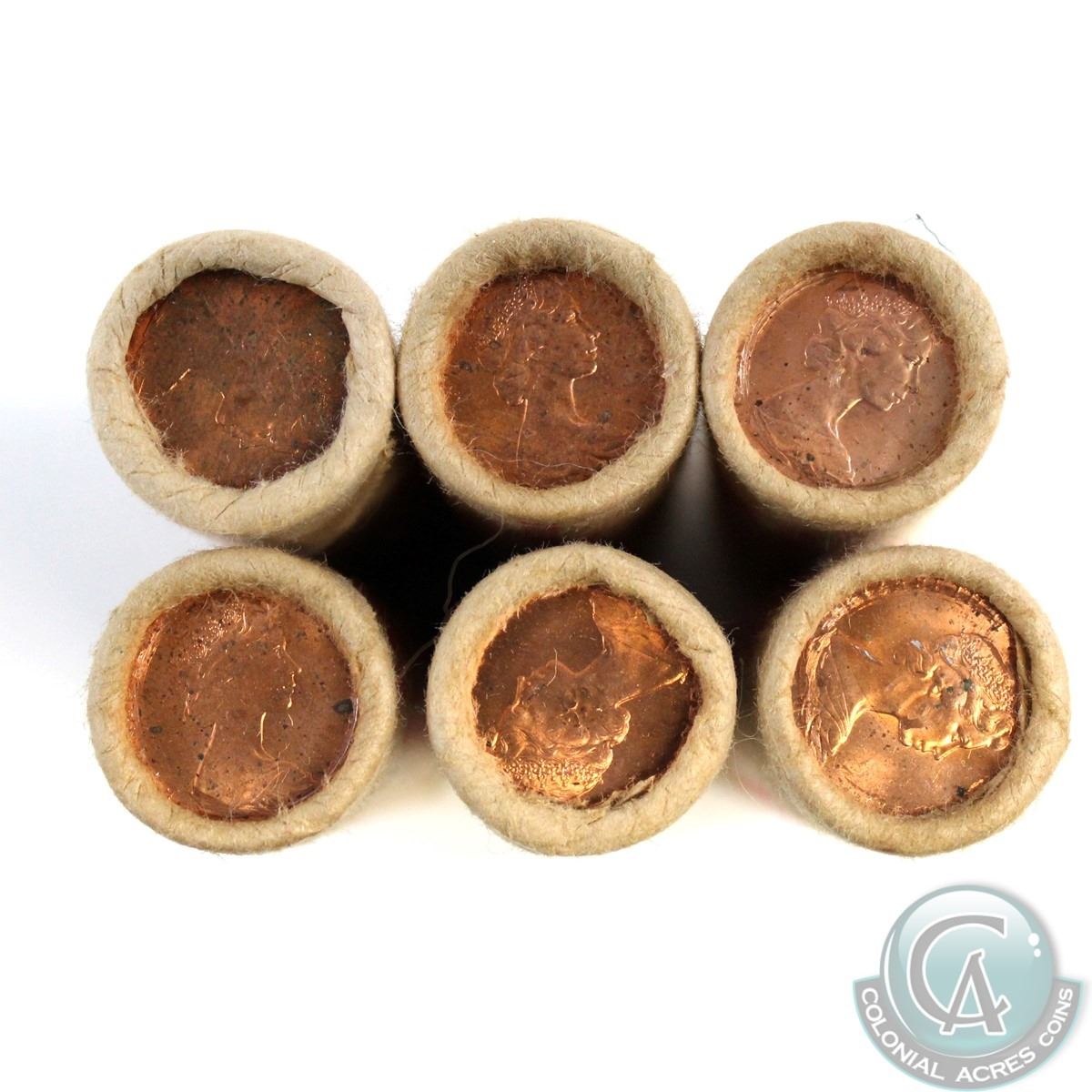 Lot of 6x Canada Double Head 1-cent Original Rolls of 50pcs. The dates of these rolls are unknown. 6pcs