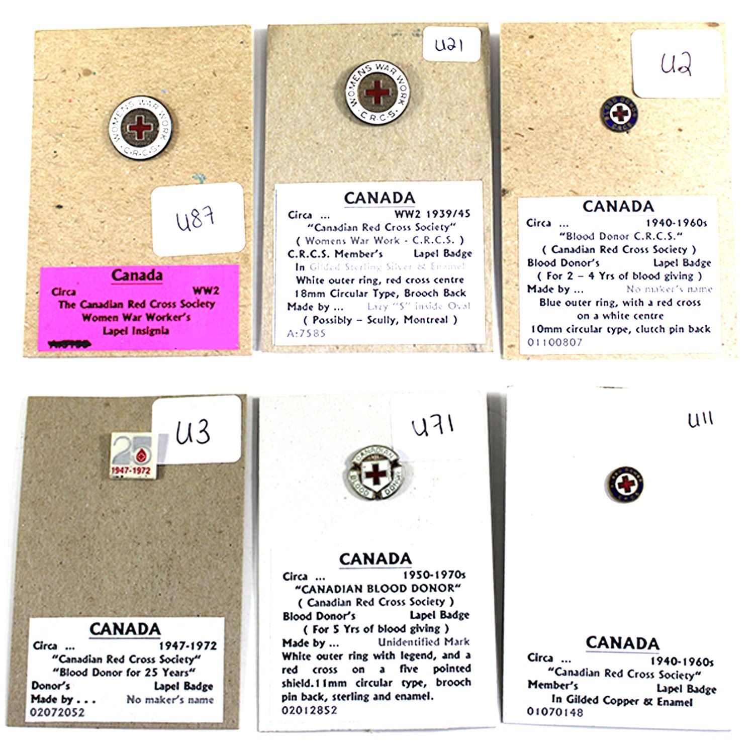 Lot of 6x Canada Red Cross Society Pins. Includes Blood Donor for 25 Years, Red Cross Society, Blood Donor for 2-4 Years, Blood Donor for 5 Years, and 2x Womens War Work.
