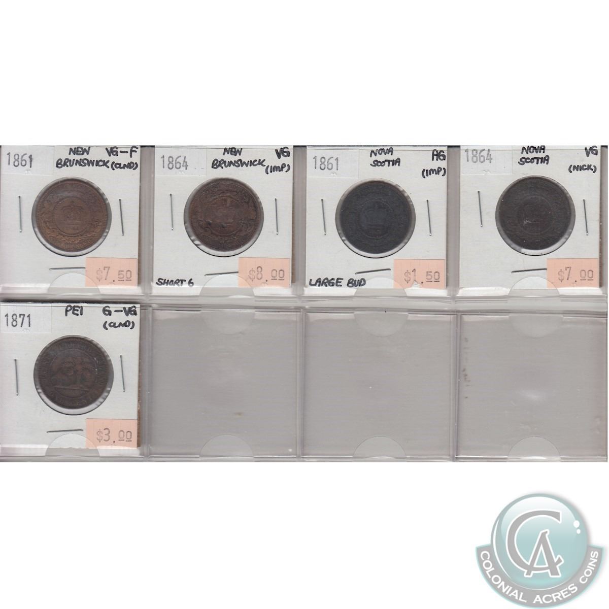 Lot of 6x Provincial 1-cent coins. You will receive 1x 1861 New Brunswick 1-cent in VG-Fine Condition, 1864 New Brusnwick 1-cent Short 6 VG, 1861 Large Bud Nova Scotia 1-cent AG, 1864 Nova Scotia 1-cent VG, and a 1871 PEI 1-cent in G-VG Condition (coins are either scratched, cleaned or impaired). Please view scan. Sold as is, No Returns.