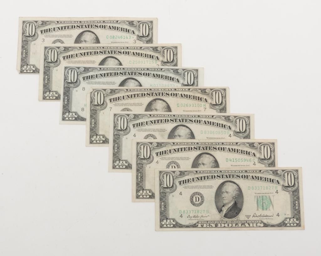 Lot of 7 1950-dated $10 Federal Reserve Bank Notes, various conditions. Est.: $85-$155.