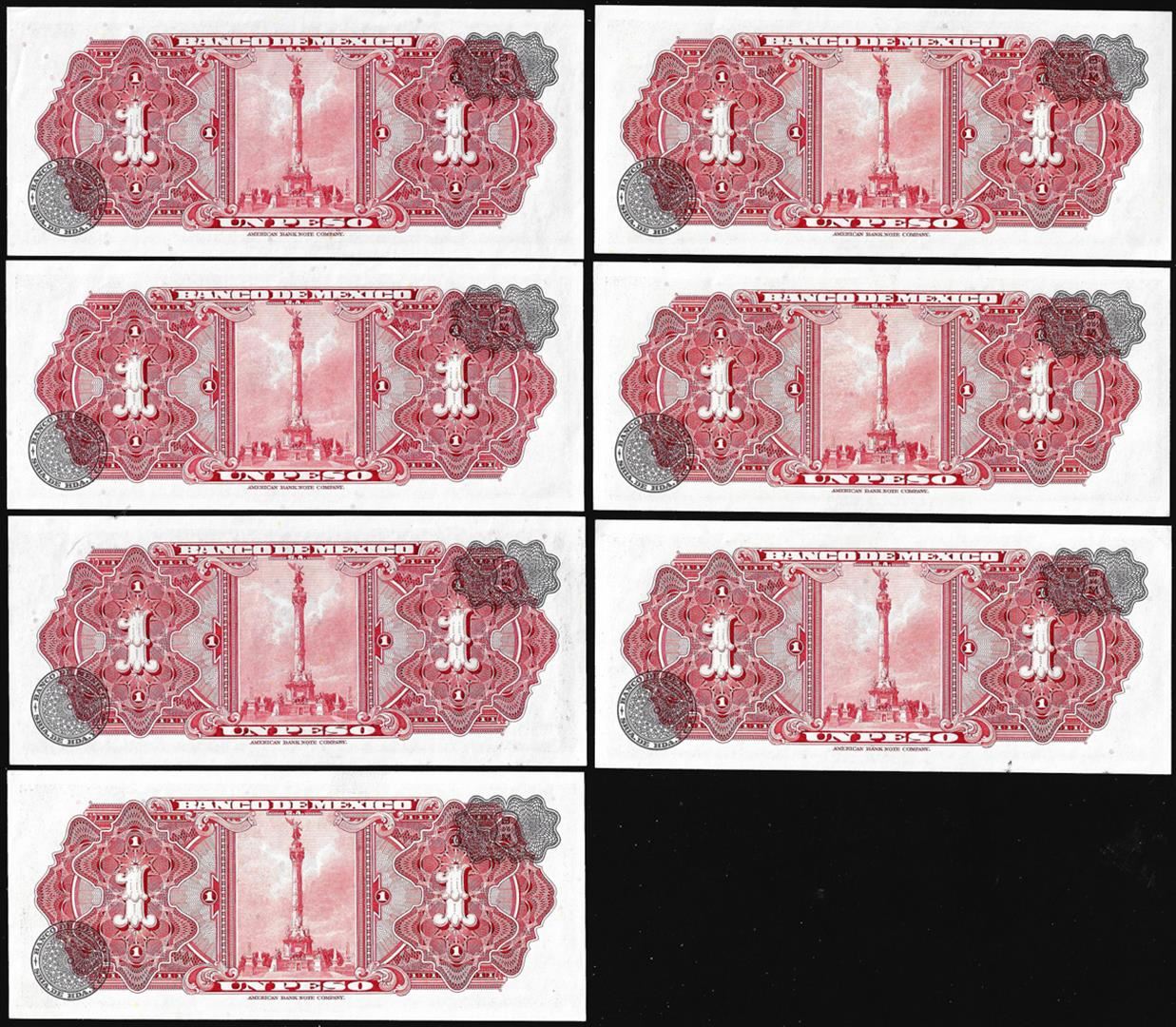 One Lot of (7) 1967 Mexico Un Peso Aztec Calendar Notes.