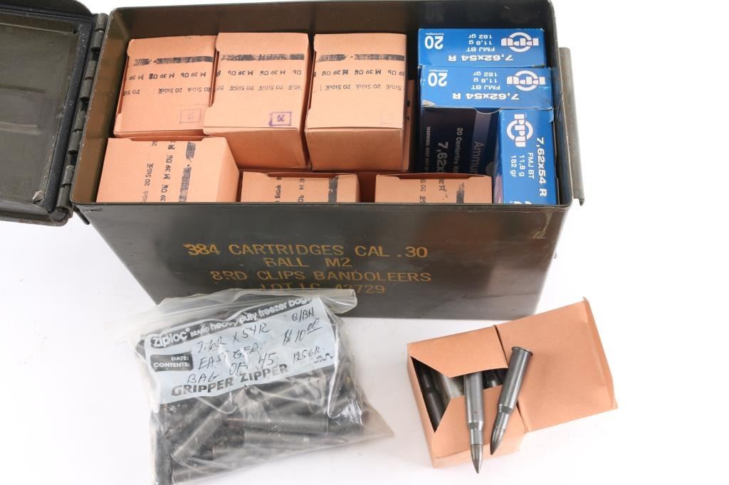 Approx. 445 rounds of 7.62 X 54R factory new ammunition w/metal ammo can. Mostly East German manufacture, 125 Gr. & approx. 60 rds from PPU, 182 Gr. FMJ BT, in 20 rd factory boxes & zip lock bag.