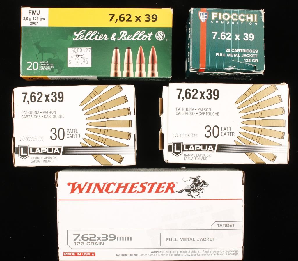 One box (20 rounds) of Fiocchi, one box of Sellier & Bellot, one box Winchester Target white box, and two boxes (30 rounds each) of Lapua. Includes a box of Hornady 123Gr FMJ bullets.