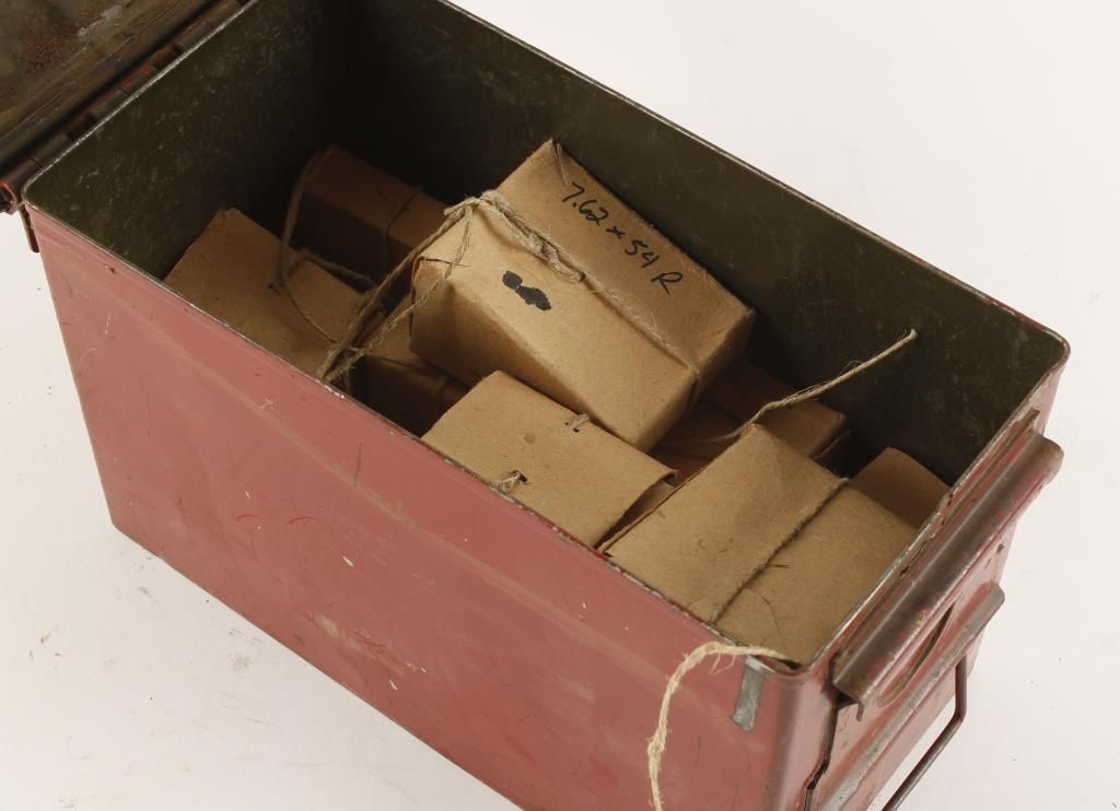 Includes 14 cardboard packages of 15 rounds each for a total of 210 round on stripper clips in large red metal ammo can.