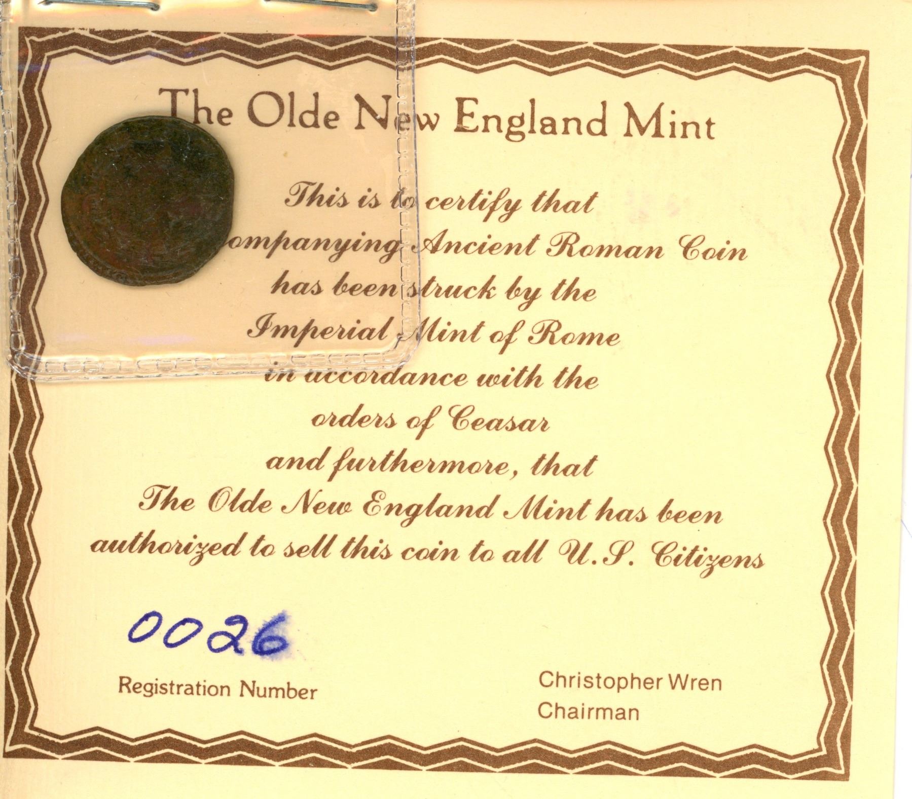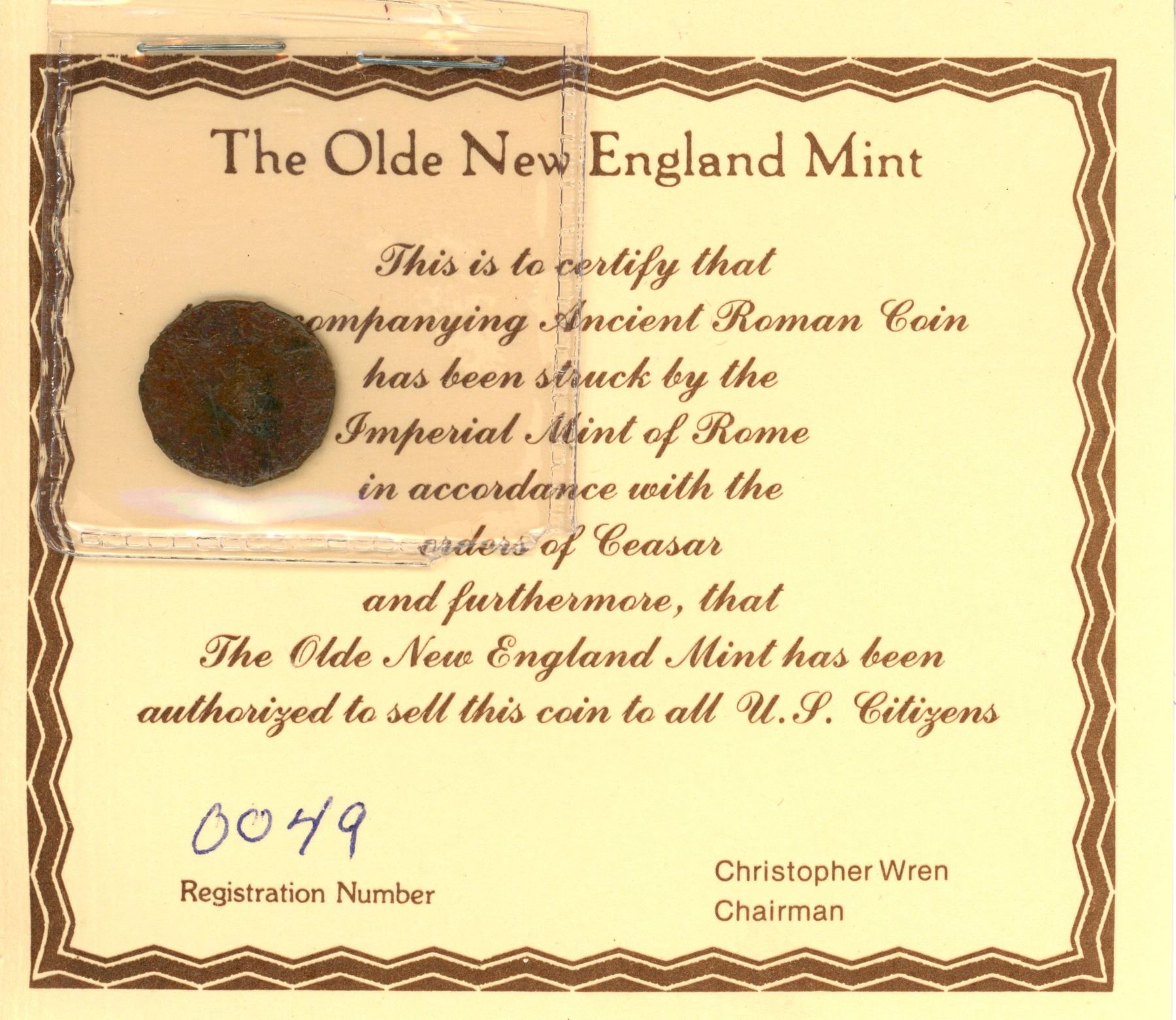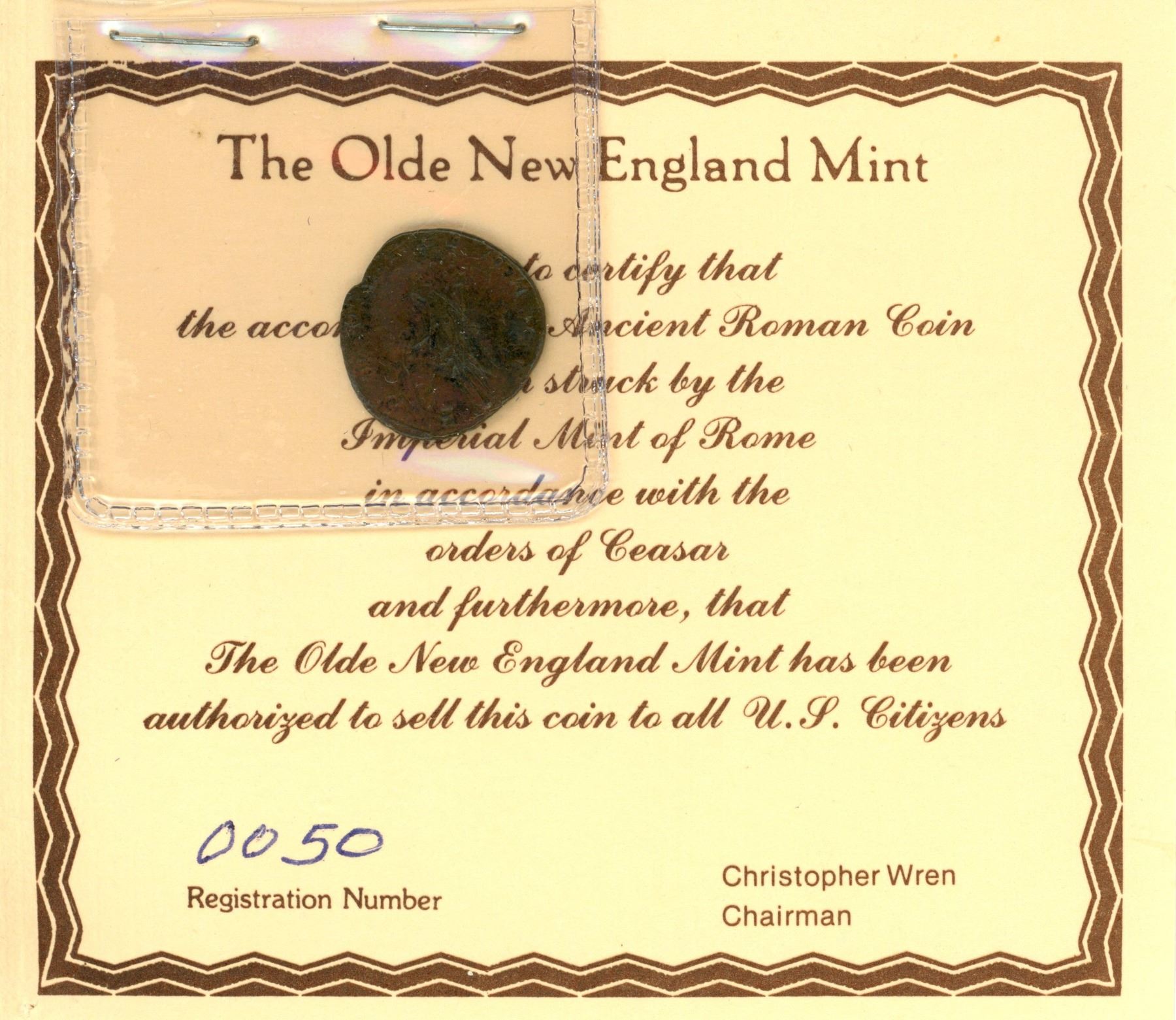 Lot of 7 Ancient Roman Coins; The Olde New England Mint; Registration #26-27 & 47-51