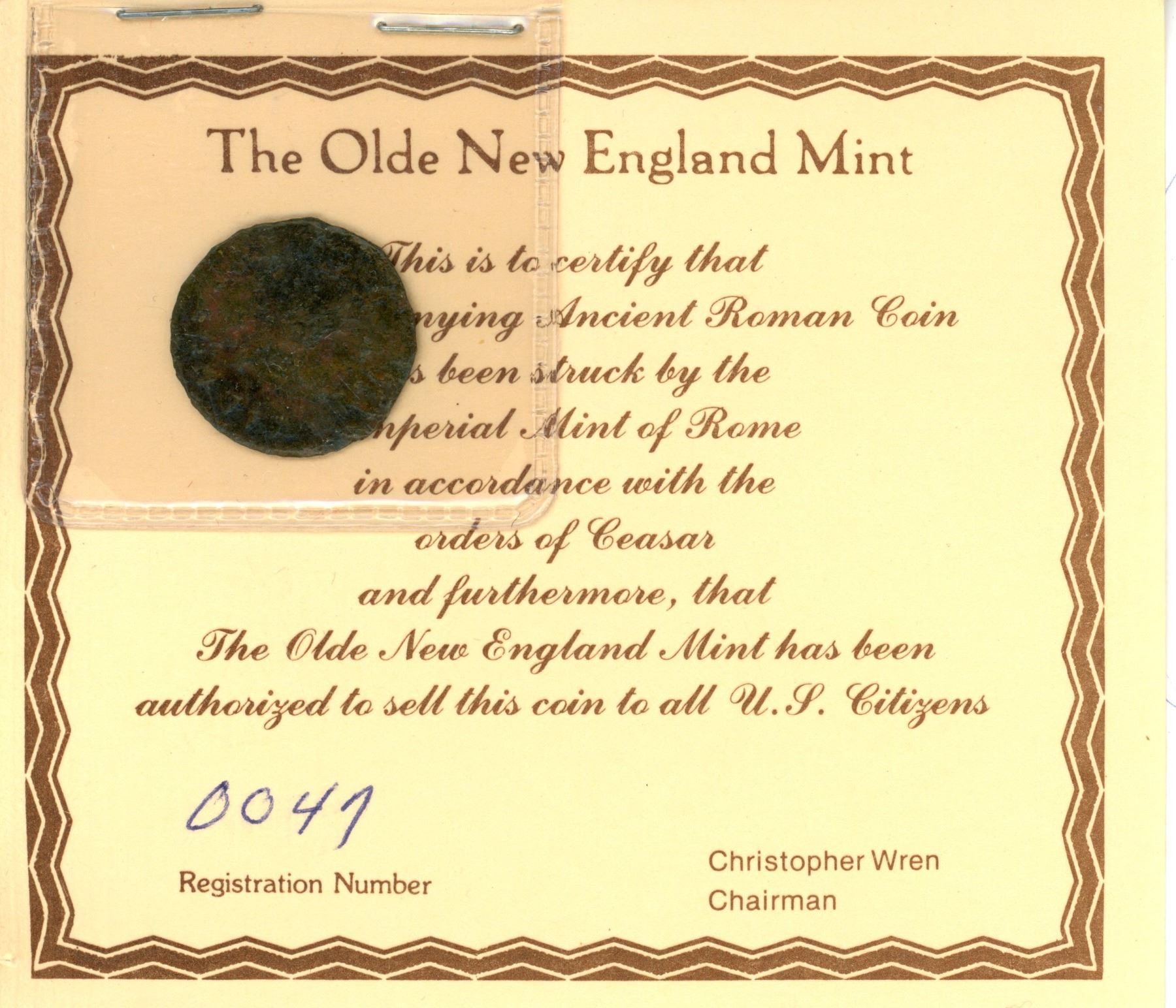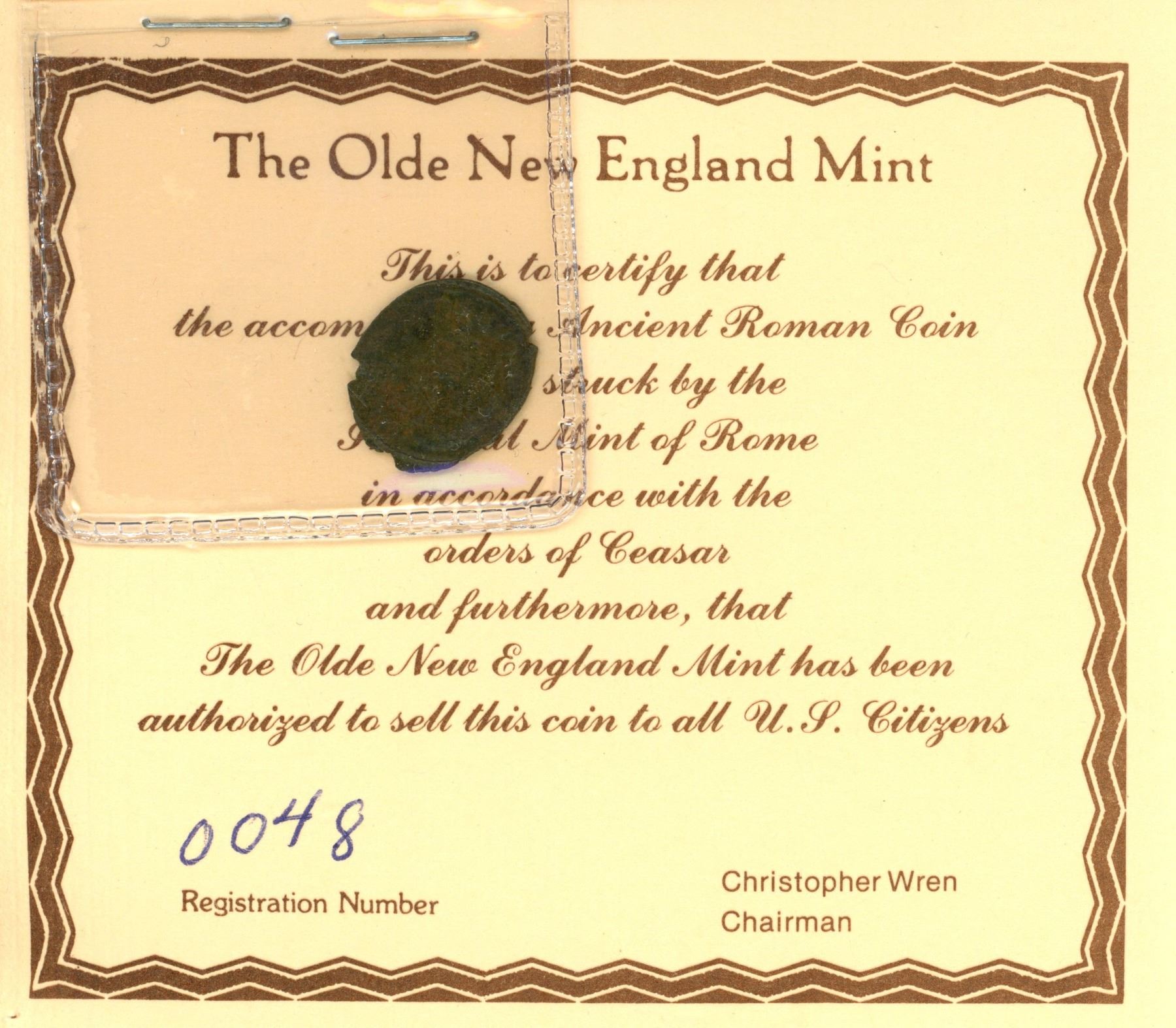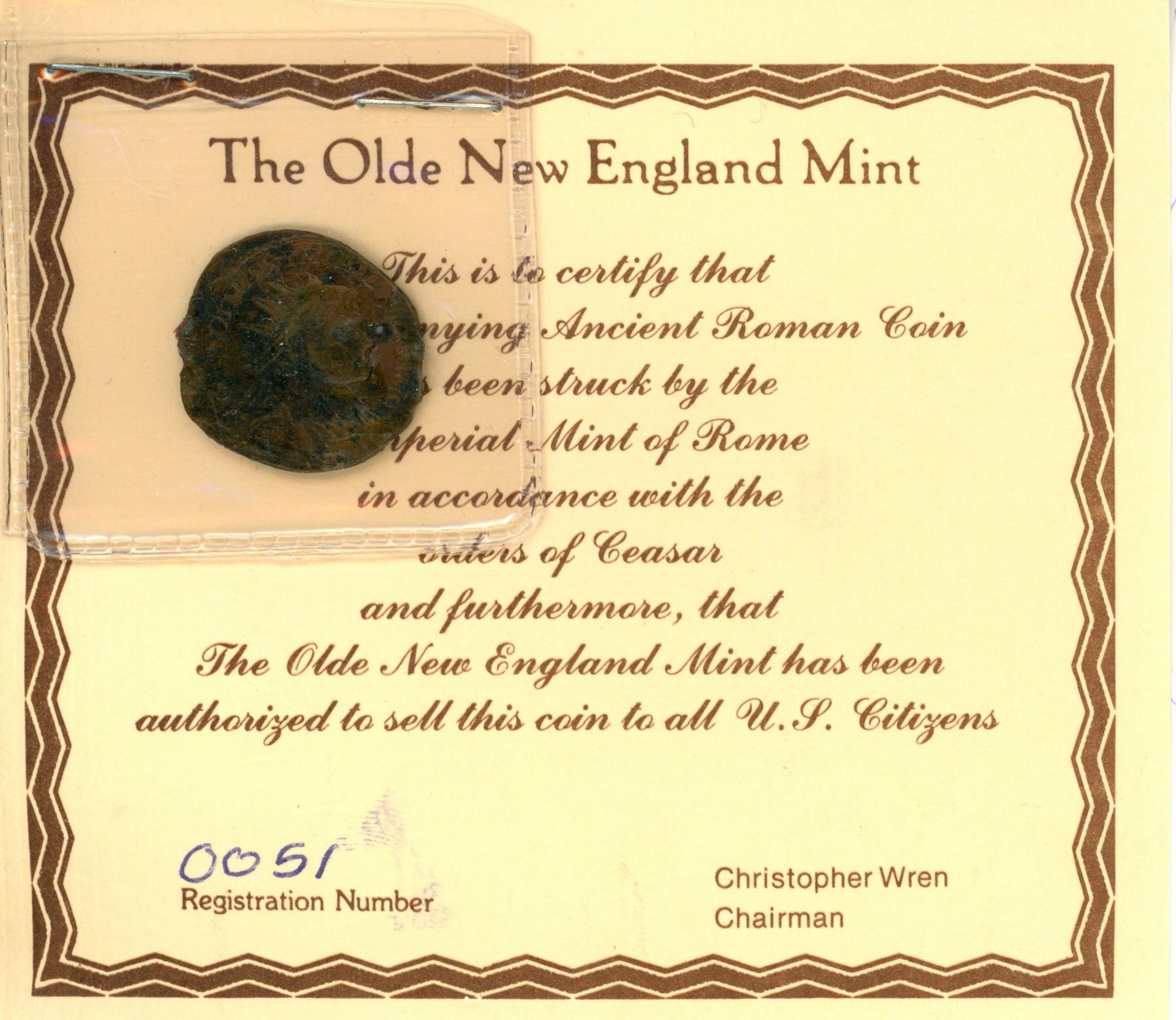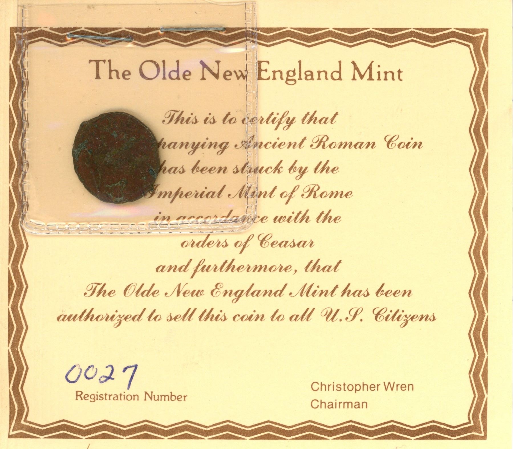 Lot of 7 Ancient Roman Coins; The Olde New England Mint; Registration #26-27 & 47-51