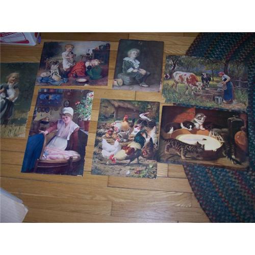 This is a lot of 7 prints.Most dating from 1901-1902 except for the one with the child blowing bubbles,that is dated 1886 and has advertising on the back.They are not all perfect but would be wonderful framed.The colors are wonderful and the subjects also.Cows,kittens,children,chickens etc.The glare on the pictures is from my light.