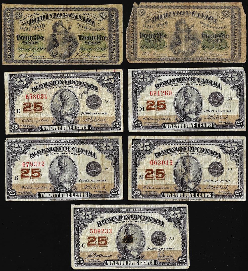 Lot of (7) Assorted Date Twenty-Five Cents Dominion of Canada Notes