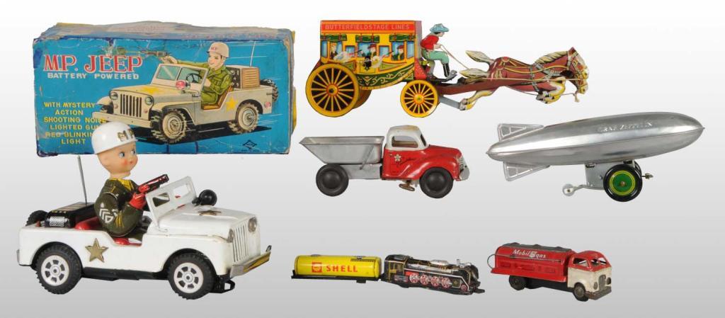Description Includes Japanese battery operated, Daiya Jeep Toy that is not working with original box, friction Butterfield Stage Line toy, small Mobil Gas truck, small Mobil Gas Car, small friction engine Shell Tank Car, Courtland wind-up dump truck, and contemporary Graff Zeppelin wind-up toy. All are working, unless stated otherwise, and have moderate overall wear. Condition (Very Good). Size Largest: 12" L.