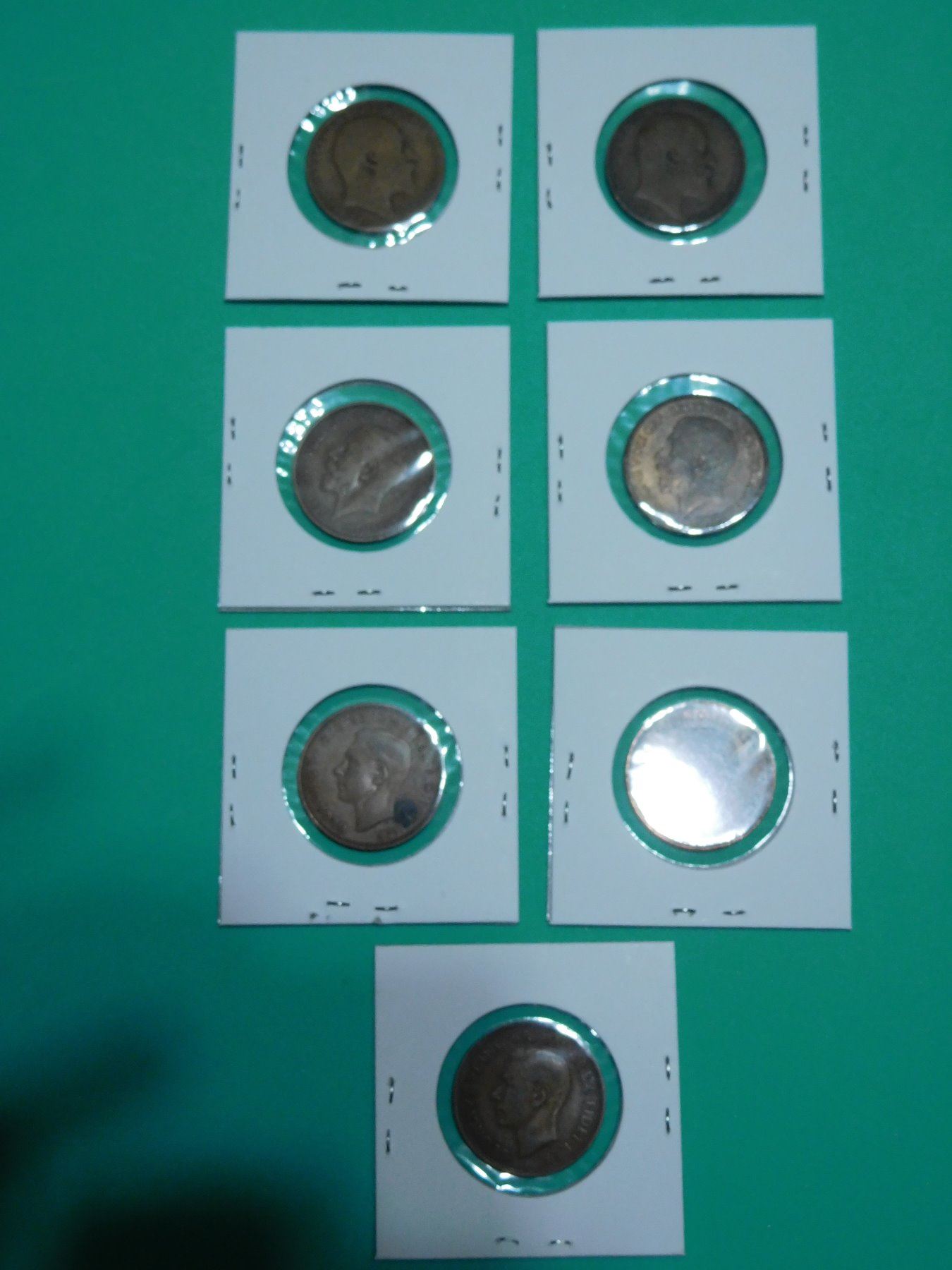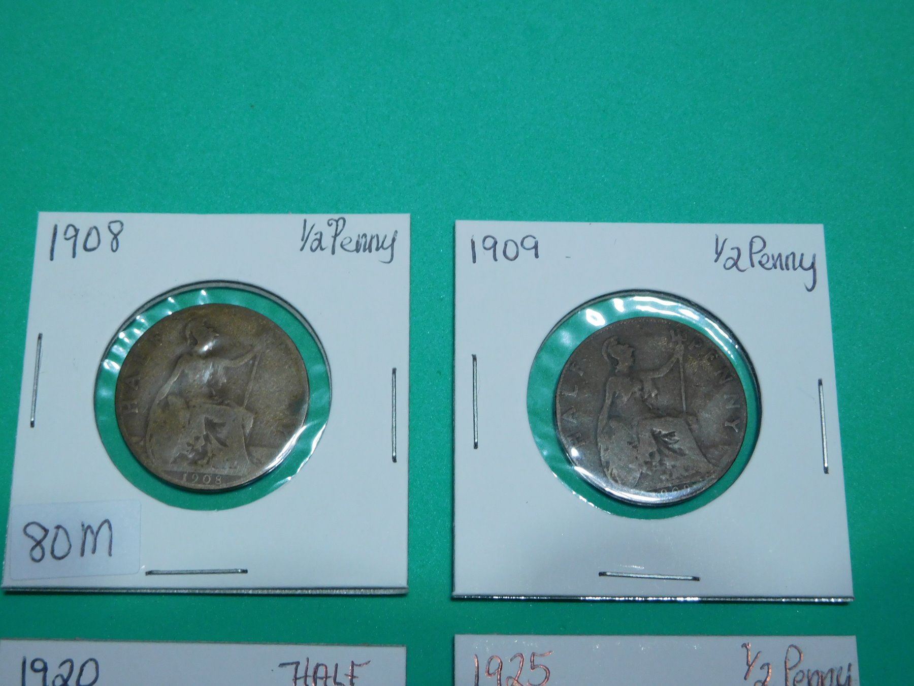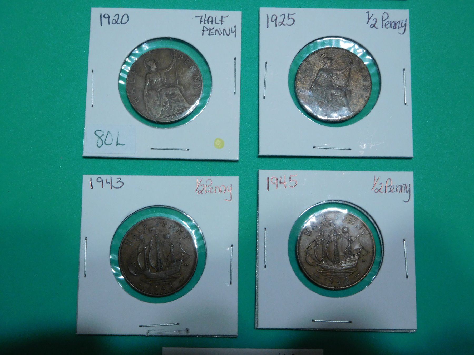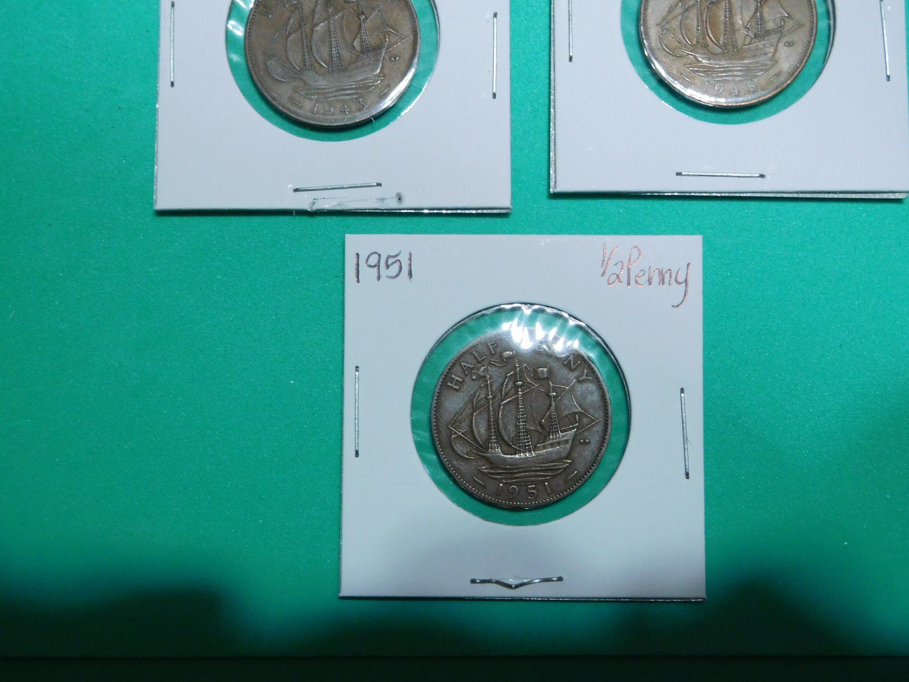 Lot of 7 British Half Pennies 1908, 1909, 1920, 1925, 1943, 1945, 1951 & Empty Blue Collection Book No. 9680 for 1/2 Pennies