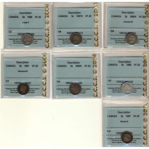 Lot of 7 CCCS VF-20 graded Five Cents; 1880H Obv#3, 1881H, 1886 Lg.6, 1888, 1890H, 1891 Obv#5, 1897 Narrow 7
