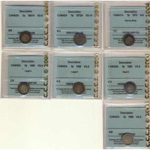 Lot of 7 CCCS graded Five Cents; 1870 RB G-6, 1872H VG-10, 1881H VG-8, 1885 Sm.5 VG-8, 1886 Lg.6 VG-8 (2), 1898 VG-8