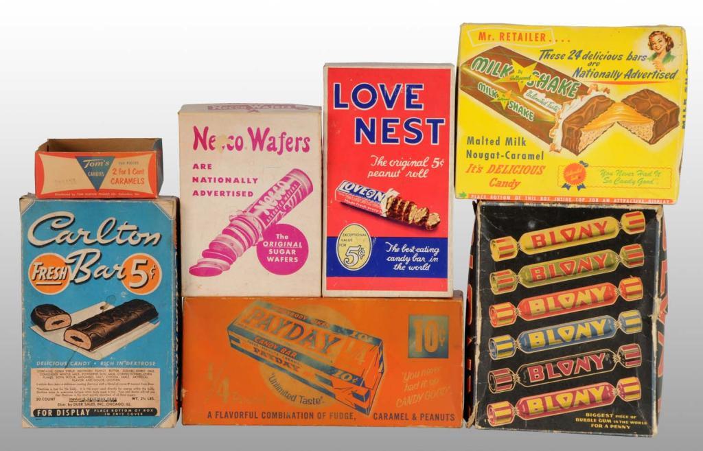 Description 1940s to Includes one Blony, one Love Nest, one Necco Wafers, one Milkshake, one Pay Day, one Carlton Bar, and one Tom's Candies lid. Some overall wear to all boxes and in various sizes. Condition (Fair - Very Good). Size Blony box: 8" x 10 - 1/2".