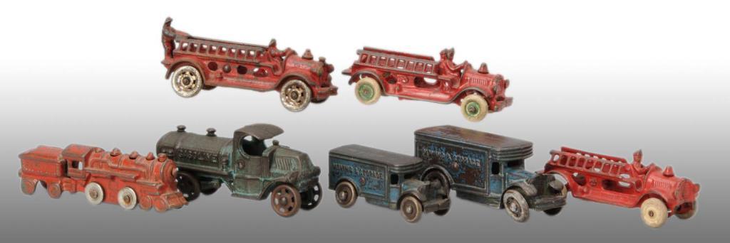 Description American. Various makers, sizes, and condition. Includes two moving vans in different sizes, one gasoline truck, one train engine and tender, and three fire ladder trucks. All have moderate overall paint loss and wear. Condition (Good - Very Good). Size Largest: 5 - 1/2" L.