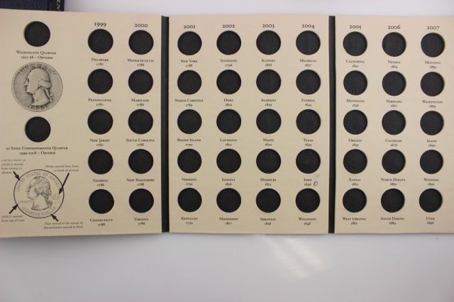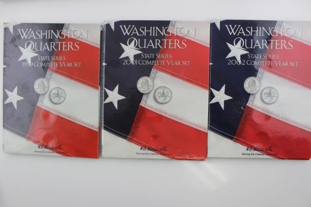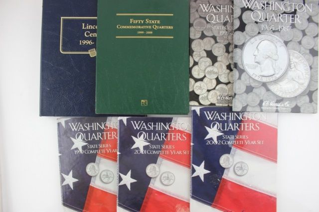 This lot is 7 coin holder books. Included in this lot are 99,01, 02 Washington State Quarter books,65-87 Washington Quarter Book, 99-03 Washington State Quarter Collection book, 99-08 Fifty State Quarter book, and one 1996 Lincoln Cent book. All books new and empty.