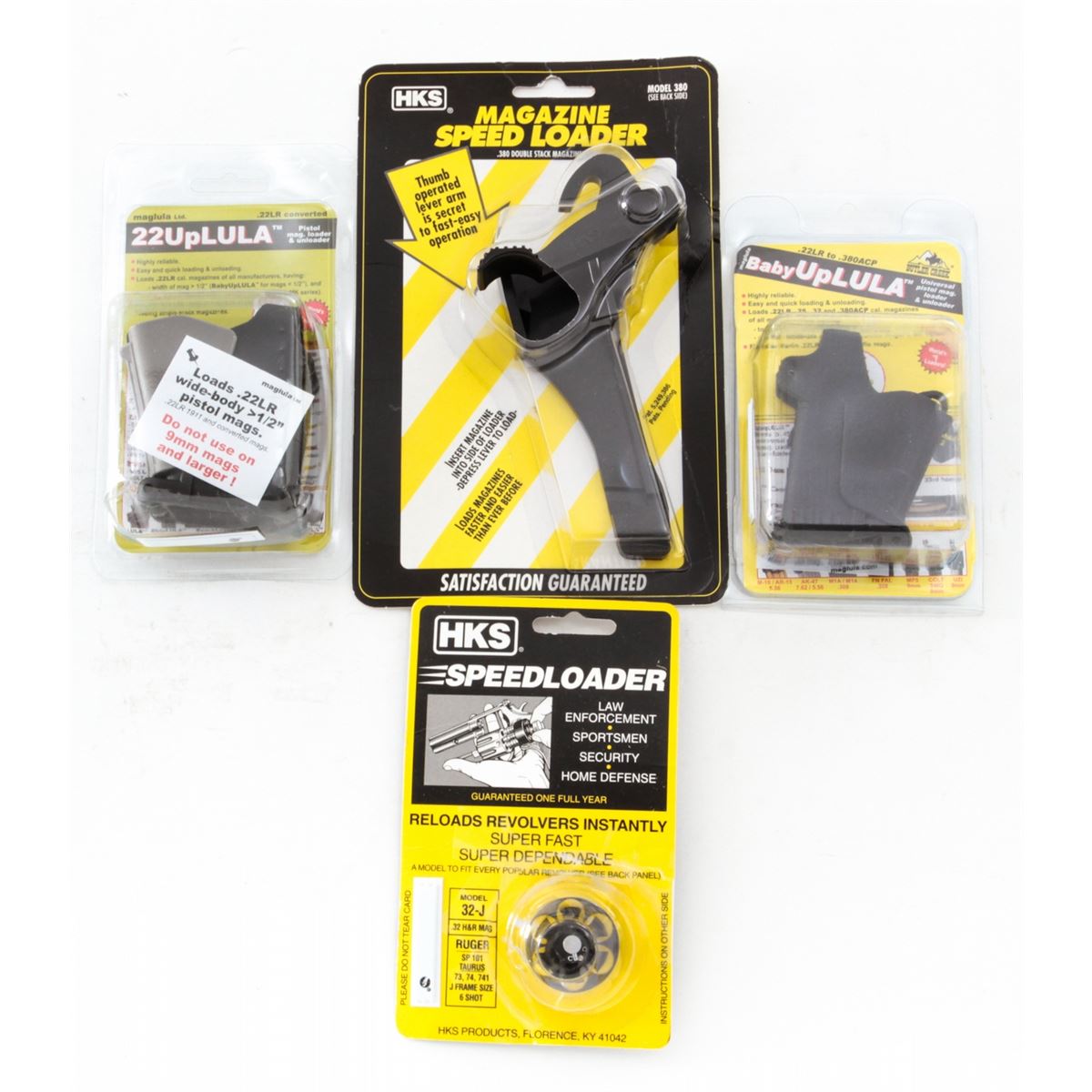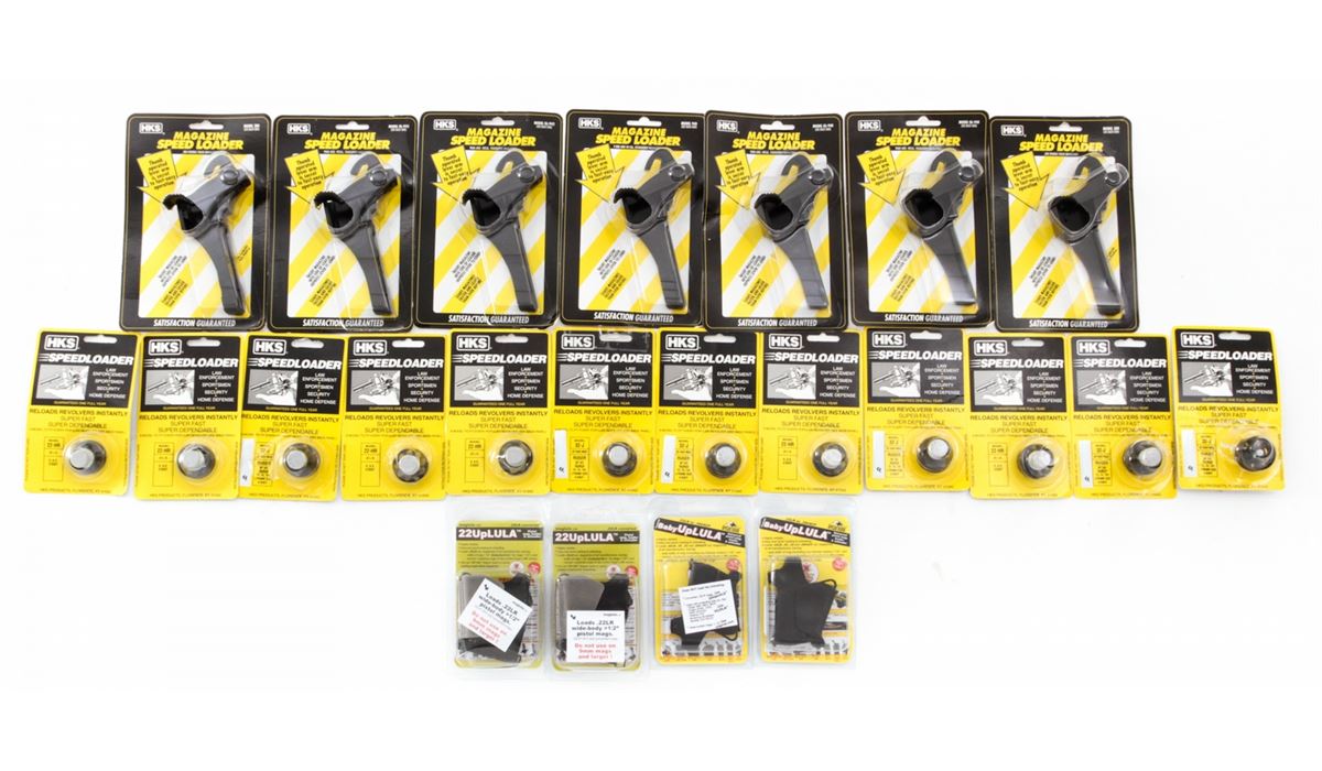 Dealer's Lot of Seven (7) HKS Magazine Speed Loaders, all for 9mm & .40 cal. staggered magazines; twelve (12) HKS Revolver Speedloaders for Ruger, Taurus & H&R; and four (4) UpLula loaders for .22 LR. All brand new in original packaging. Retails @ over $325/lot. Est.: $150-$200/lot. (Field Time)