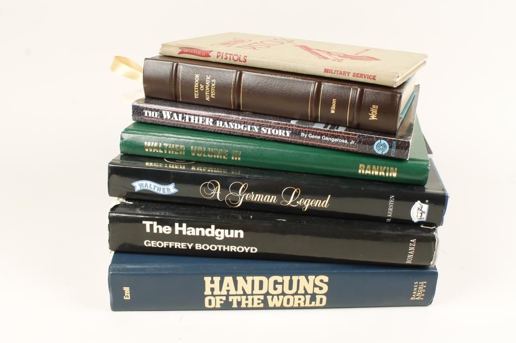 Includes (1)Textbook of Automatic Pistols, (1)The Handgun, (1)Handguns of the World, (1)The Walther Handgun Story, (1)Walther Pistols, (1)Walther Vol III 1908-1980, and (1)Walther, A German Legend.
