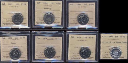 Lot of 7 ICCS 25 Cents. 1972 PL66 Cameo, 1976 PL66,1991 SP67, 1996 SP67, 2006 PF68 UHC, 2006 Braver