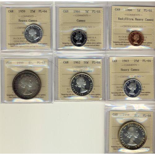 Lot of 7 ICCS graded PL64 coins, includes, 1964 1¢ Red UHC, 1964 5¢ Cameo, 1959 25¢ HC, 1963 PL64 HC, 1962 50¢ HC, 1959 $1 and 1959 $1 Cameo.