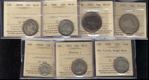 Lot of 7 ICCS graded coins. 10 Cents; 1902H VG8, 25 Cents; 1870 Obv.1 VG8, 1886 Obv.4 G6, 1890H VG8, 1899 VG8, 50 Cents 1905 VG10 scratches, 1907 VG10. Sold as is, no return.