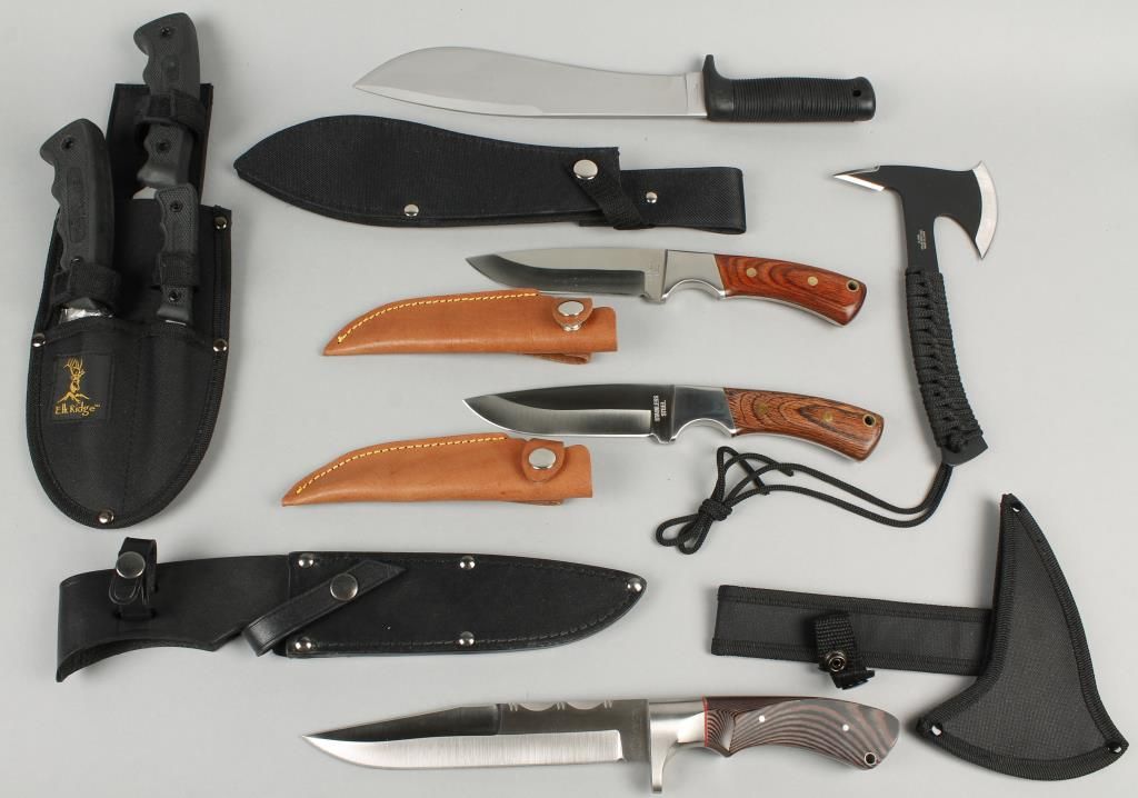 Including: a Magnum 02MAG15, 12" overall, with sheath; an Elk Ridge ER-018 compact field dressing kit, all 440 stainless steel blades, ergonomic grips including a heavy duty cleaver, a gut hook, and a small hunter; Tomahawk XL1506 survival axe with sheath; Camp USA machete style knife with holster; and 2 manufactured knives, brand unknown, 10" overall with sheaths.