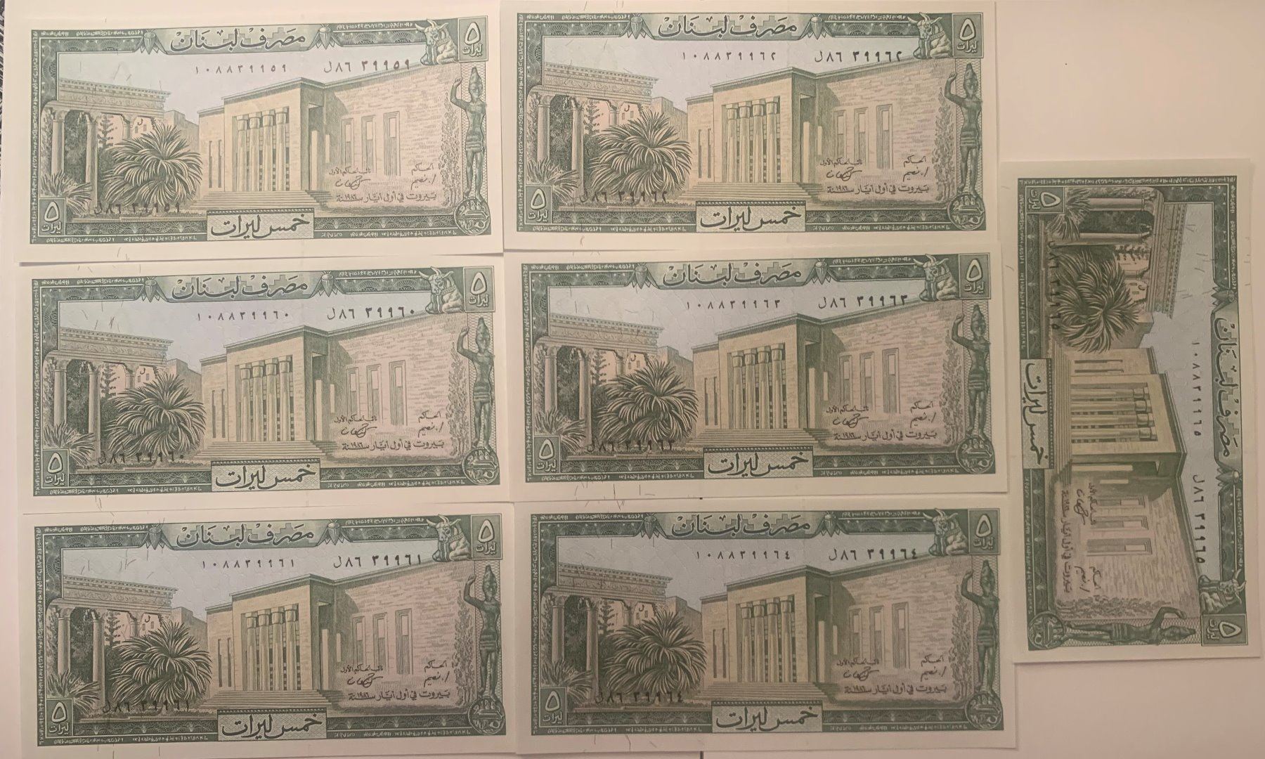 Lot of 7 Lebanon 5 Livres 1986 P 62 UNC Sequential Serial L8639959 to L8639965