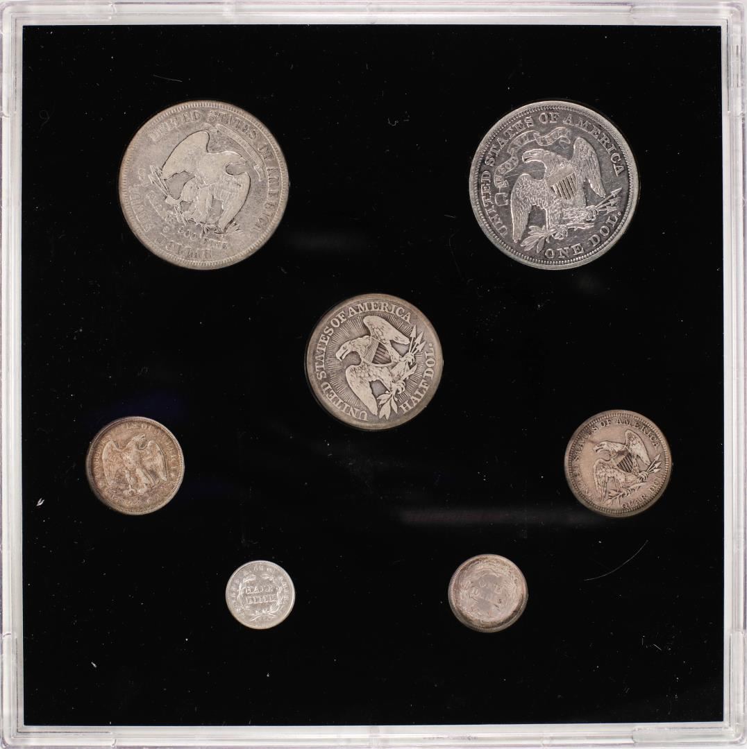 One Lot of (7) Liberty Seated Type Coins in Capital Plastics Board.