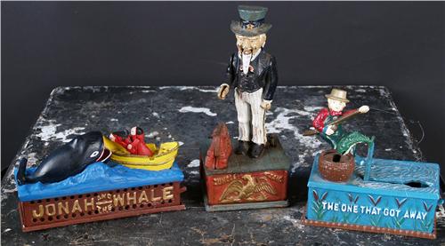 Lot of 7, Mechanical Banks Jolly N. , etc 1. Uncle Sam..2. Jonah & the Whale 3. Hometown Batter 4. Trick Dog 5. The 1 that got away 6. Two Jolly N's