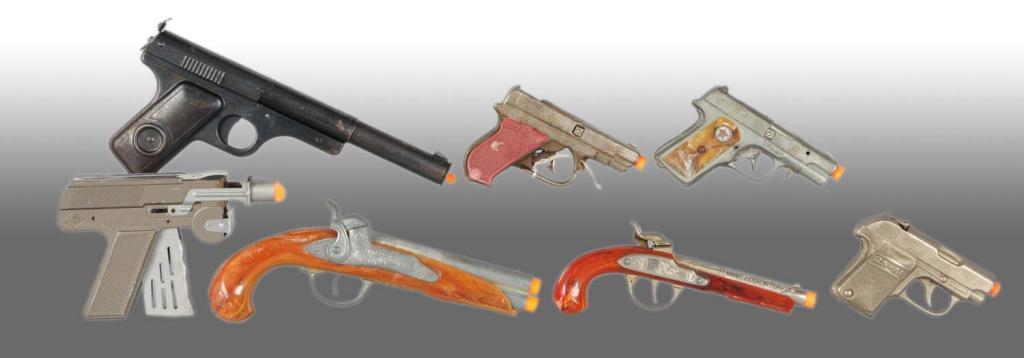 Includes two Hubley pirate guns, three small Kilgores, one Super Numatic and one Daisy Air Pistol. All have moderate wear. Cap Gun Condition (Very Good). Size Largest: 10" L.