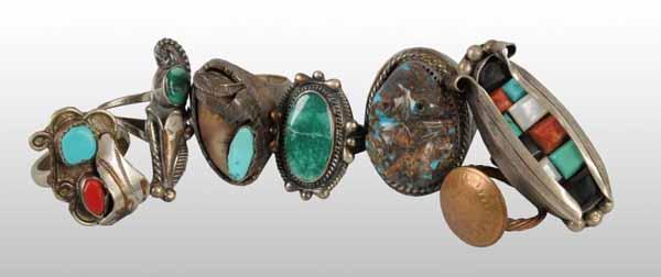 Description One has a bear claw and a piece of turquoise, one has onyx pearl turquoise and coral, one is an Indian penny, one turquoise frog, and two plain turquoise. Condition (Excellent). Size Size Range: 6 - 9.