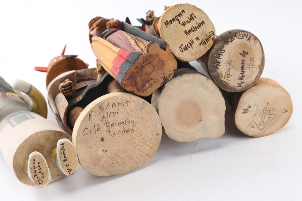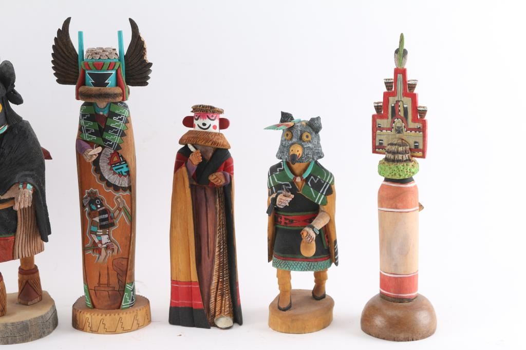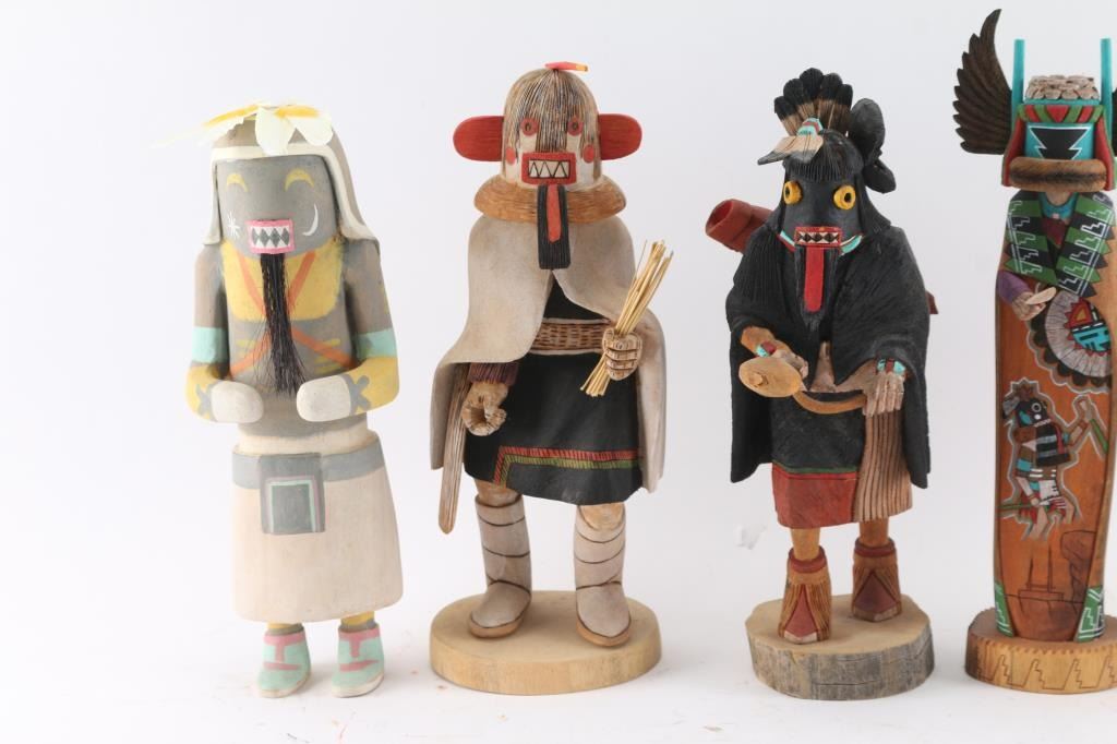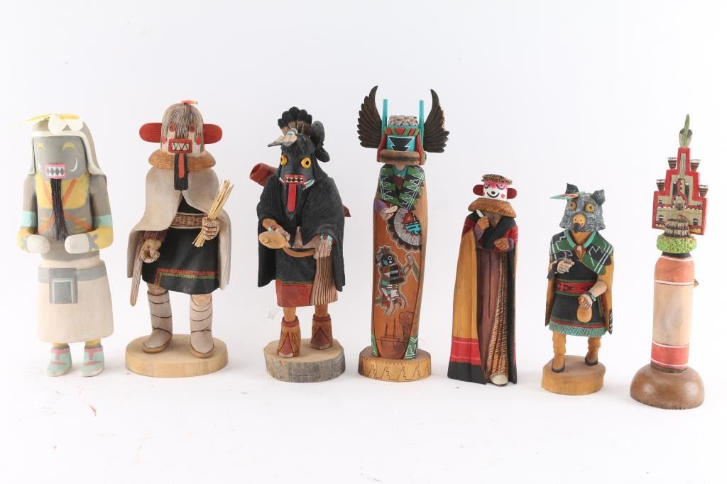 (1) Modern style kachina, maker marked on bottom, measures 11 1/4". Has slight damage to right headdress.
