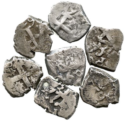 Lot of 7 Potosi, Bolivia, cob 1/2R of Charles III, various dates (1760-71), where visible. KM-41. 12.1 grams total. The most difficult cob 1/2R to collect by date are Charles III, like these, for they are always on small flans with weak peripheries and sprawling monograms that, when centered, take up all the real estate; but most of the coins in this lot do show clear dates, and all are nicely toned, Fine+ on average, only one with a hole. Two (1760 and 1771) are pedigreed to the Paul Karon collection (Ponterio, March 1990), lots #1192 and 1202.