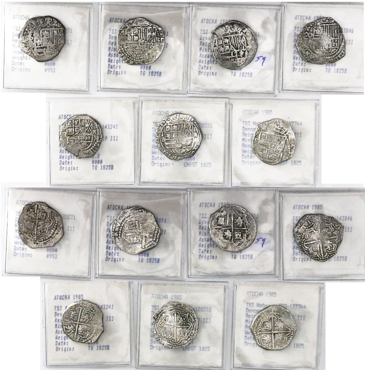 Lot of 7 Potosi, Bolivia, cob 2 reales, Philip III, various assayers (where visible), all Grade-1 or -2 quality but certificates missing. KM-8. 46.37 grams total. Little or no corrosion, nice shields and crosses, very popular for jewelry. With Fisher tags #127744, 128512, 135271, 143091, 143241, 143846 and 143881. Recovered from: Atocha, sunk in 1622 west of Key West, Florida